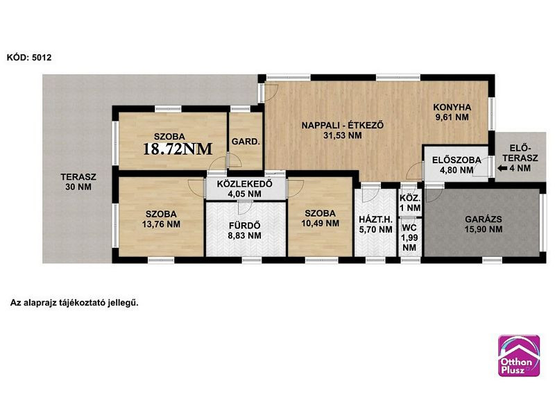 A ház felosztása a következőképpen alakul: elő-terasz (4m2), előszoba (4.80m2), nappali-étkező (31.53m2), konyha (9.61m2), közlekedő (4.05m2, 1m2), fürdőszoba + wc (8.83m2), wc (1.99m2), háztartási helyiség (5.70m2), 3 szoba (18.2m2, 13.76m2, 10.49m2),garázs (15.90m2),terasz (30m2).