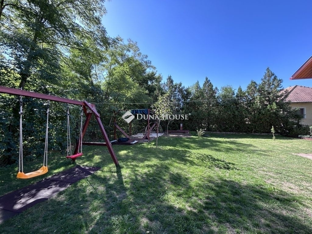 A telek hátsó részén a füvesített udvaron egy mindent elnyelő tároló található (igény esetén garázsként is funkcionálhat), valamint a gyerekek nagy-nagy örömére egy saját kis játszótér kerti sütögetővel kiegészítve.
