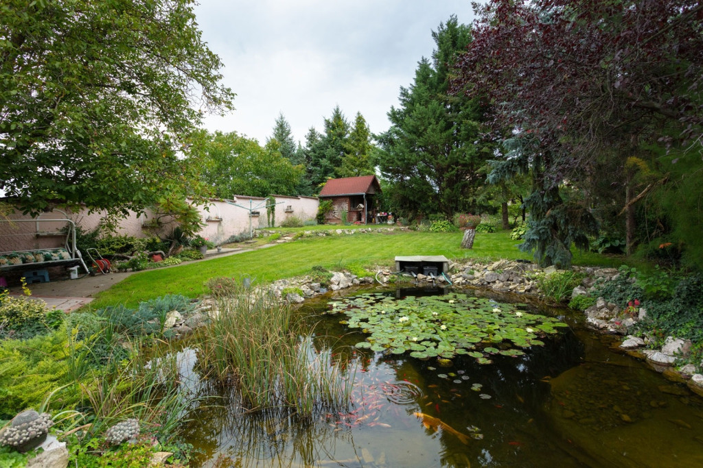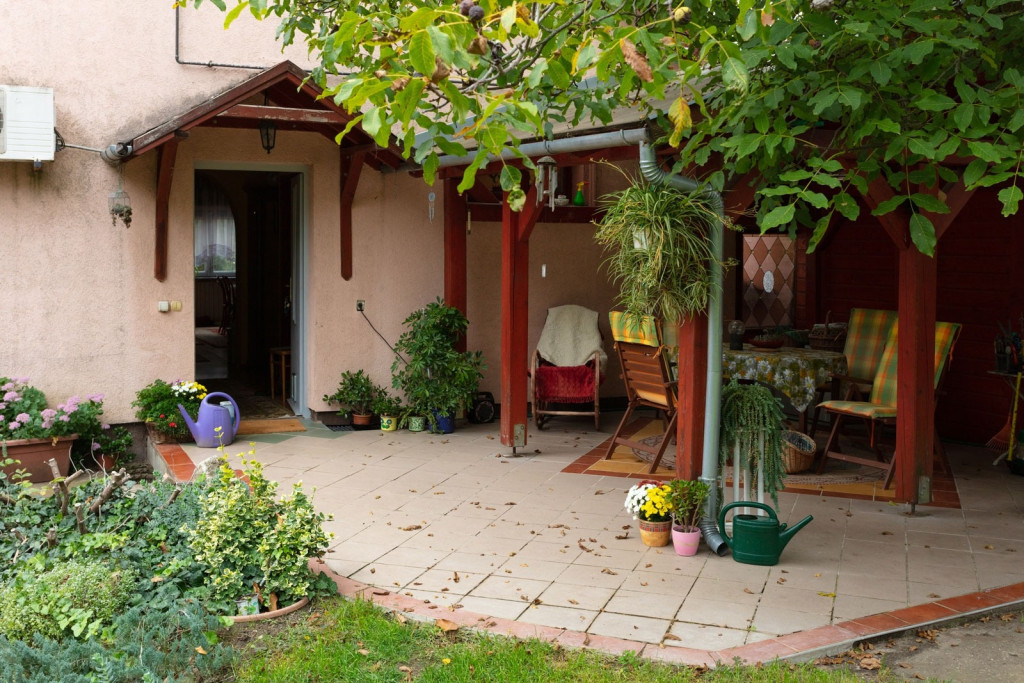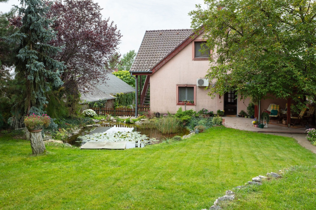 A házhoz egy kényelmes, fedett terasz tartozik, a gondozott kert kitűnő lehetőséget nyújt a pihenésre, kikapcsolódásra, gyönyörködhetünk a halastó és a növények látványában. A kert végében egy kis szerszámok tárolására alkalmas házikó található.