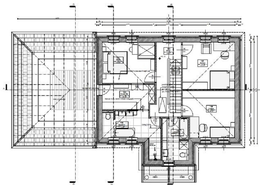 Emelet: 2 tágas fürdőszoba wc-vel, járható gardróbszoba, 3 hálószoba, közlekedő. A