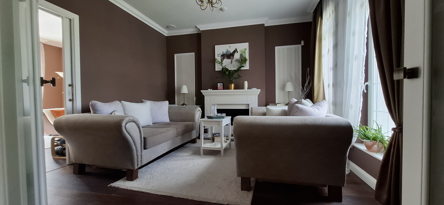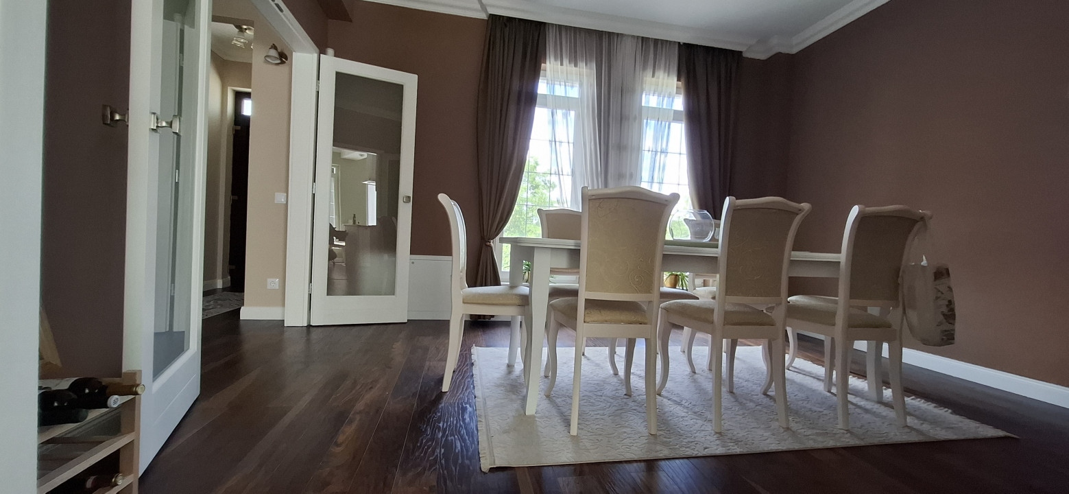 Mind kívülről mind belülről stíluskommunikátor által megálmodott kialakítás, melyet az angol György korabeli stílus ihletett. Kúria jellegű családi ház.