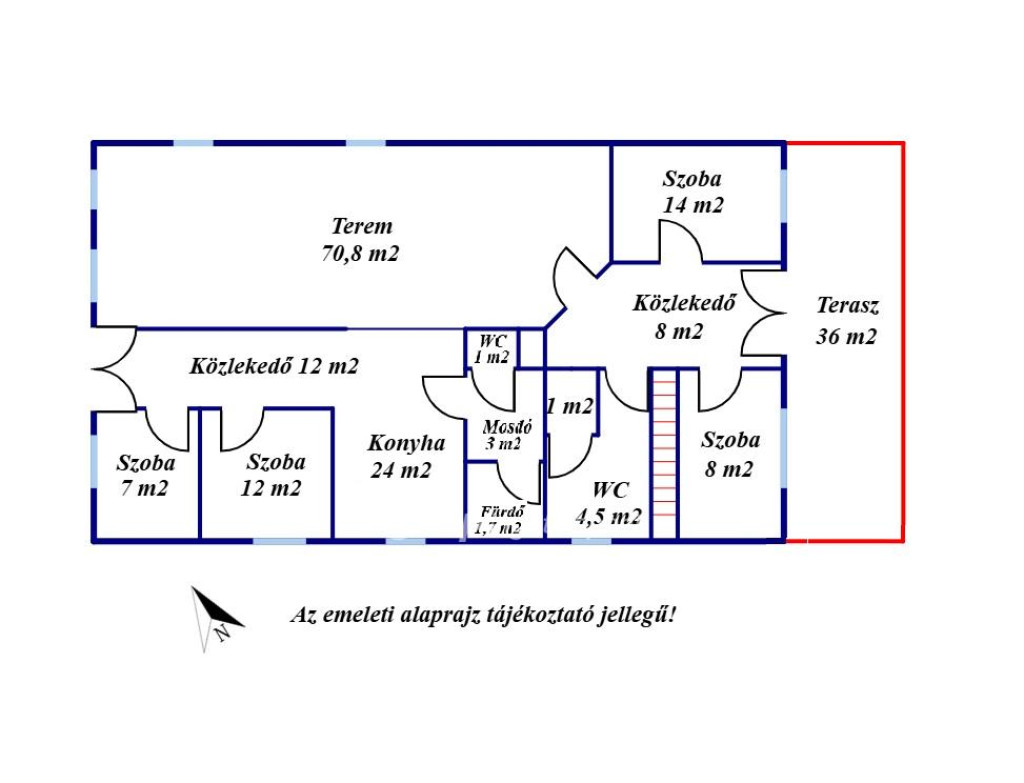Helyiségek: 3 szoba, 2 félszoba, nappali, 2 fürdőszoba, 5 WC, 2 konyha étkezővel, 3 közlekedő, 4 tároló, kazán helyiség, előtér és hatalmas terasz, illetve 2 lakás