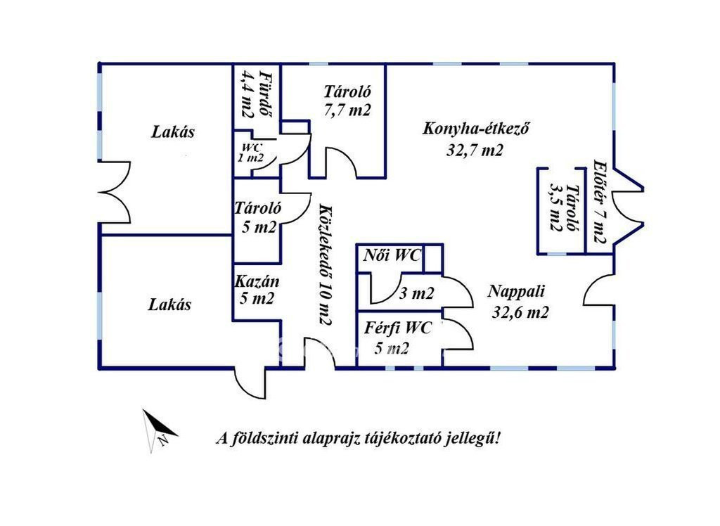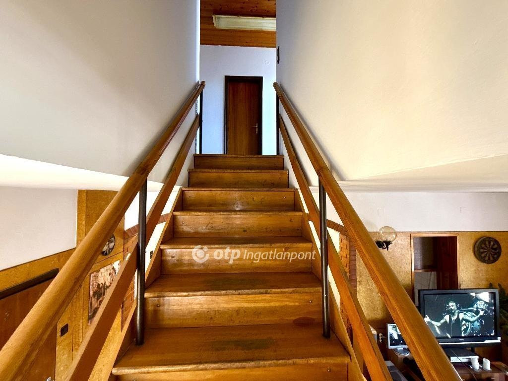 Helyiségek: 3 szoba, 2 félszoba, nappali, 2 fürdőszoba, 5 WC, 2 konyha étkezővel, 3 közlekedő, 4 tároló, kazán helyiség, előtér és hatalmas terasz, illetve 2 lakás