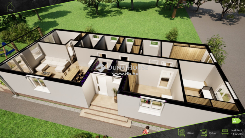 A korszerű, könnyűszerkezetes ingatlan 700 nm-es közművesített telekre épül, melyet a kivitelező tereprendezés után, lekerítve ad birtokba.