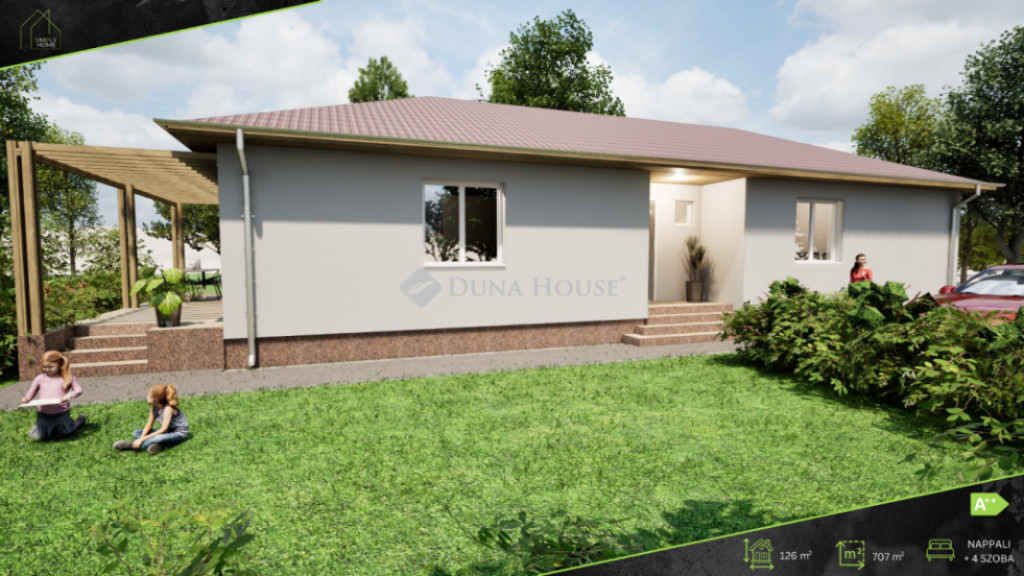 Felsőpakonyban, családias hangulatú szomszédságban kínálunk 126 m2 alapterületű új építésű ingatlant nagyon kedvező áron! A korszerű, könnyűszerkezetes ingatlan 700 m2-es közművesített telekre épül, melyet a kivitelező tereprendezés után, lekerítve ad birtokba. Tágas, pergolás terasz és térkövezett, fedett kocsibeálló is kialakításra kerül.A családiház helyiségeit alább részletezem:Előtér: 3 m2Amerikai konyhás nappali: 30.5 m2Szoba 1: 11 m2Szoba 2: 11.5 m2Szoba 3: 12 m2Szoba 4: 12 m2Fürdőszoba 1: 5.5 m2Fürdőszoba 2: 5.5 m2WC: 1.7 m2Tároló: 5.0 m2Közlekedő : 7.5 m2Terasz: 20 m2A könnyűszerkezetes házak az építkezés jövője. Álmodja meg velünk prémium minőségben kivitelezett otthonát, melyet rövid határidővel, teljes körű kivitelezéssel adunk át a szerződéskötéstől számított 5-7 hónapon belül!A teljes ház 90 cm mély, szigetelt sávalapra épül SIP szerkezettel. A ház elrendezésével kapcsolatban jelenleg még számtalan változtatási lehetőséggel élhet új tulajdonosa. A főfalak és a vizes blokkok kivételével szinte bármelyik helyiség kialakítása történhet az Ön kéréseinek megfelelően, az álomotthon vevői igények alapján személyre szabható és alakítható!Az otthonban a kellemes hőérzetet hőszivattyús fűtési rendszer és korszerű Fan-coil szellőztetés garantálják egész évben. A SIP házak energetikailag is prémium kategóriát képviselnek, melyet a 3 rétegű 7 kamrás nyílászárók és a 30 cm-es Isocell padlás szigetelés is fokoznak. Tőlünk vásárolt korszerű otthona garantáltan alacsony rezsivel fenntartható.A szigeteléshez, festéshez kizárólag magas minőségű anyagok kerülnek felhasználásra.A szobák és a gardrób melegburkolatokat, a nappali, étkező, fürdők, közlekedő és a tároló kerámia, a terasz fagyálló kerámia burkolatot kap, melyet az Ön ízlésének megfelelően választhat a szerződéskötés után.A vételár tartalmaz általunk beépített konyhabútort 2 millió forint értékben!Kérésre extraként igényelhető Smart home rendszer, további kertrendezés, de akár napelem telepítését is vállaljuk megbízható, kiváló referenciákkal rendelkező partnereinkkel.Amennyiben felkeltettem érdeklődését keressen bizalommal további információért!Ingatlan eladás és vétel teljes körű ügyintézése, megbízható ügyvédi háttér biztosítása, ingyenes ingatlan tanácsadás, teljes körű és gyors bankfüggetlen hitelügyintézés, biztosítás, energetikai tanúsítvány akár hozott ingatlanra is az ország piacvezető ingatlanközvetítő hálózatának támogatásával!