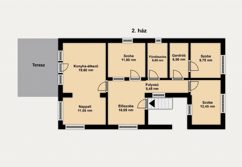 - 2. házban nappali + 3 szoba, konyha - étkező, folyosó, előszoba, gardrób került kialakításra
