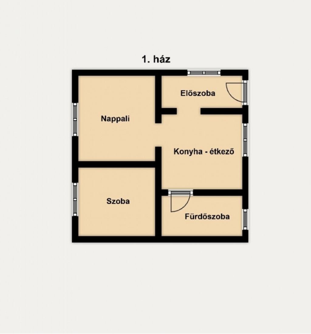 - 1. házban nappali + 2 szoba, konyha, fürdőszoba található