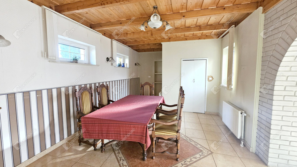 - a családi összejöveteleknek a gigantikus étkező, és a hozzá kapcsolódó konyha ad teret, mely közvetlen kapcsolattal rendelkezik a kb. 40 m2-es fedett terasszal