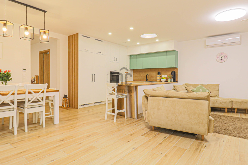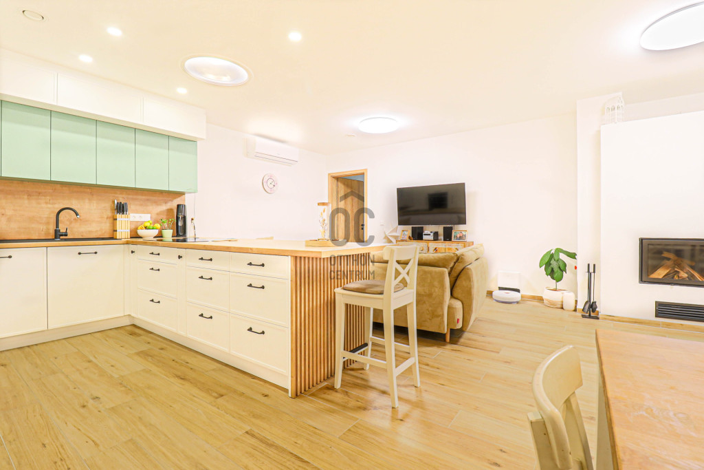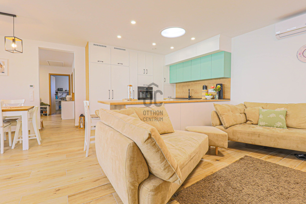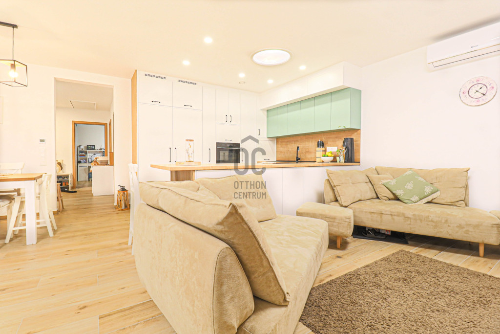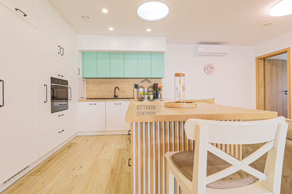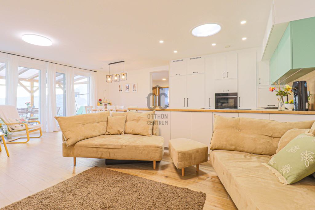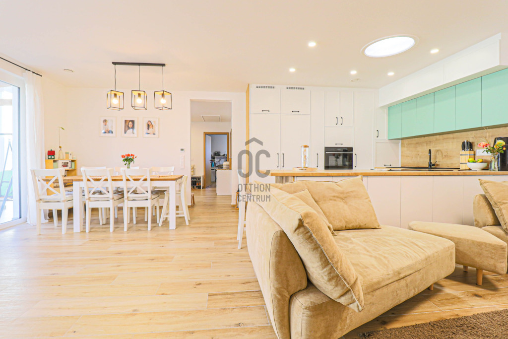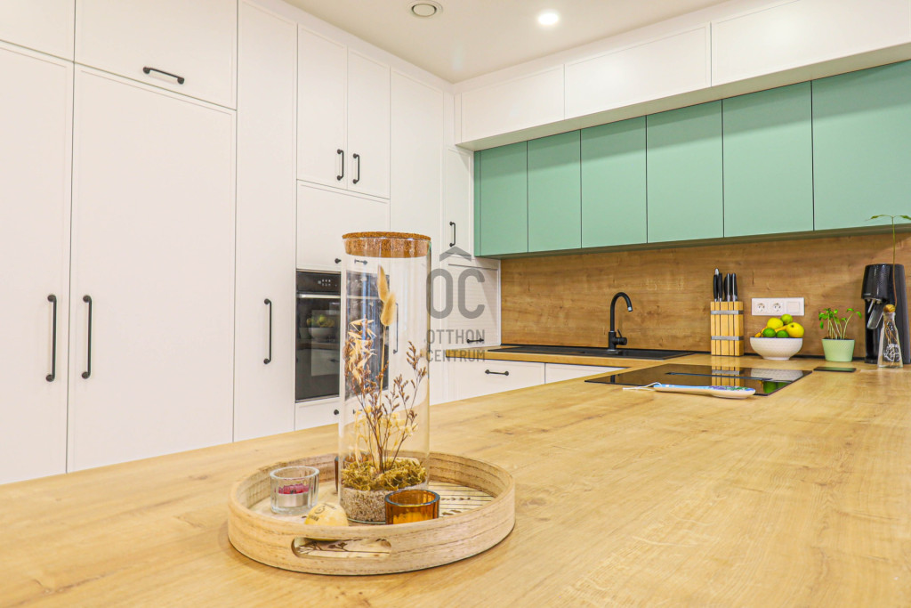 Minőségi konyhabútor és letisztult, modern burkolatok teszik otthonossá a nappali–konyha terét, amely a fedett terasszal szinte egybenyitható.