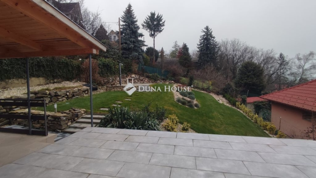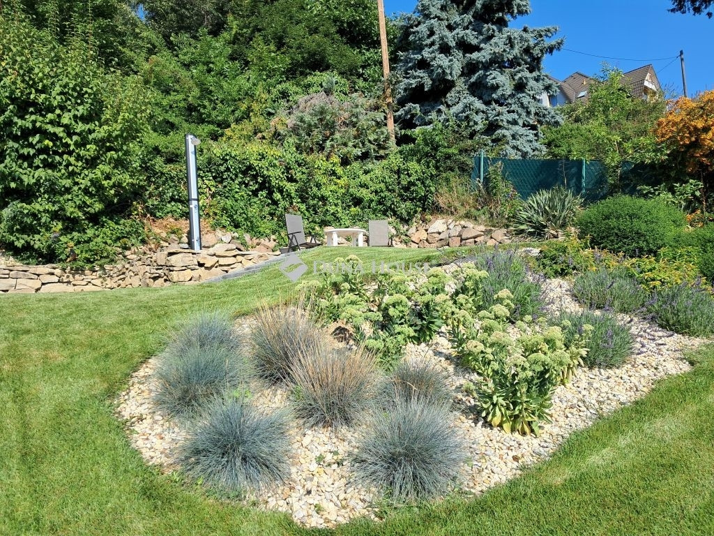 A terület 545m2. Az utcafrontról térkövezett autóbeálló fogad minket, ahol két autó tud parkolni. A kertet precíz tereprendezéssel alakították ki, hogy kihasználható legyen a lejtőssége miatt. A sziklakert és füves terület aránya megfelelő, melynek hosszútávú gondozását az öntözőrendszer könnyíti meg.