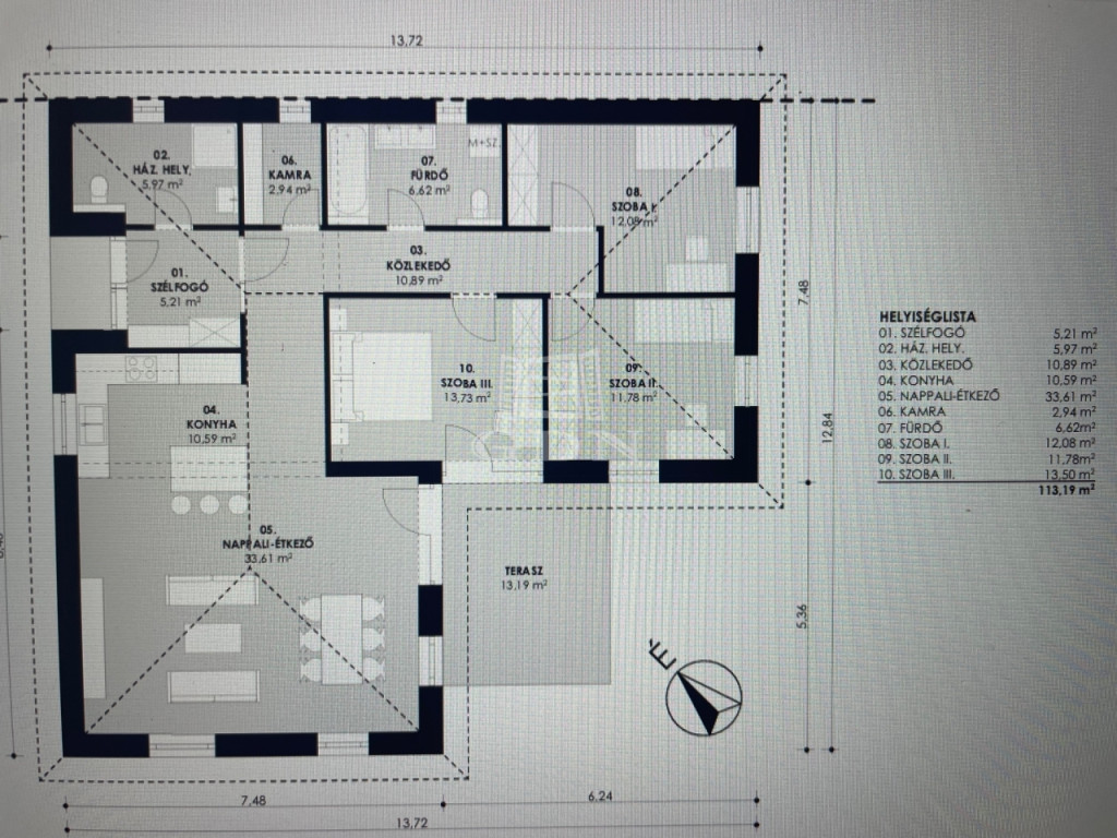 ideálisak lehetnek gyerekeknek, vendégszobának vagy dolgozószobának. A mindennapi kényelmet szolgálja egy fürdőszoba, kamra és továbbá egy WC és kézmosóval ellátott háztartási helyiség is helyet kapott a tervben a bejárat közelében. Az étkező után egy teraszra léphetünk ki, amely tökéletes helyszíne lehet reggeli kávézásnak vagy baráti összejöveteleknek.