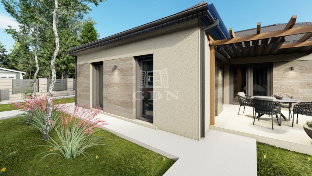 A ház korszerű építési megoldásokkal készül: Porotherm téglafalak és 15 centiméteres hőszigetelés gondoskodnak a stabilitásról és az energiahatékonyságról, míg a háromrétegű üvegezésű nyílászárók