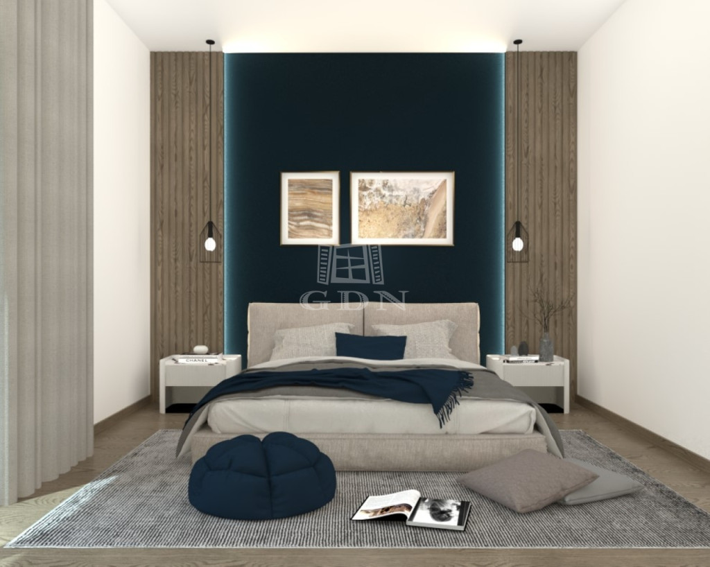 A ház elrendezése átgondolt és praktikus: a központi tér egy világos nappali, amely egybenyílik az étkezővel és az amerikai konyhával. Innen nyílnak a hálószobák, összesen három külön szoba, amelyek