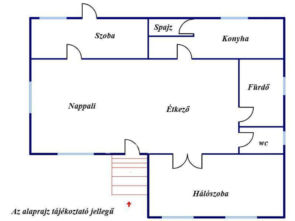 A ház helyiségei: 2 tágas szoba, nappali-étkező egy légtérben, konyha, kamra, fürdőszoba, külön helyiségben a WC,