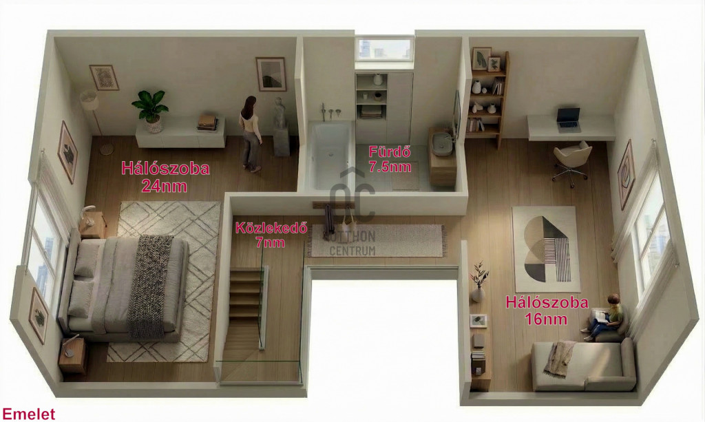+ Az emeleti tetőtérben további két külön nyíló tágas hálószoba lett kialakítva, továbbá egy kádas fürdőszoba, így ha két generációs házat keresel, vagy nagy a család, akkor is el fogtok férni kényelmesen.