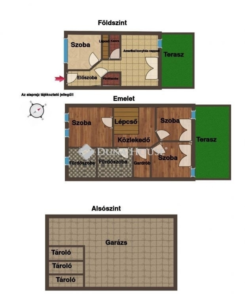 Emelet: 3 szoba, 2 fürdőszoba (az egyik a hálóból nyílik), gardrób, előszoba