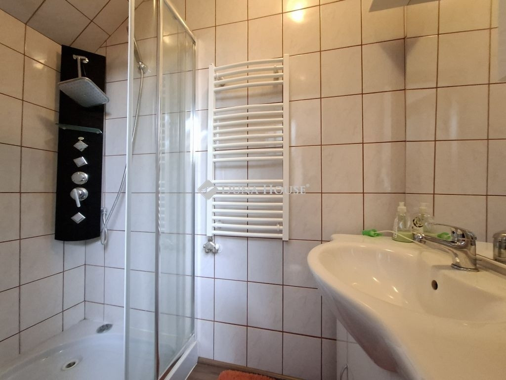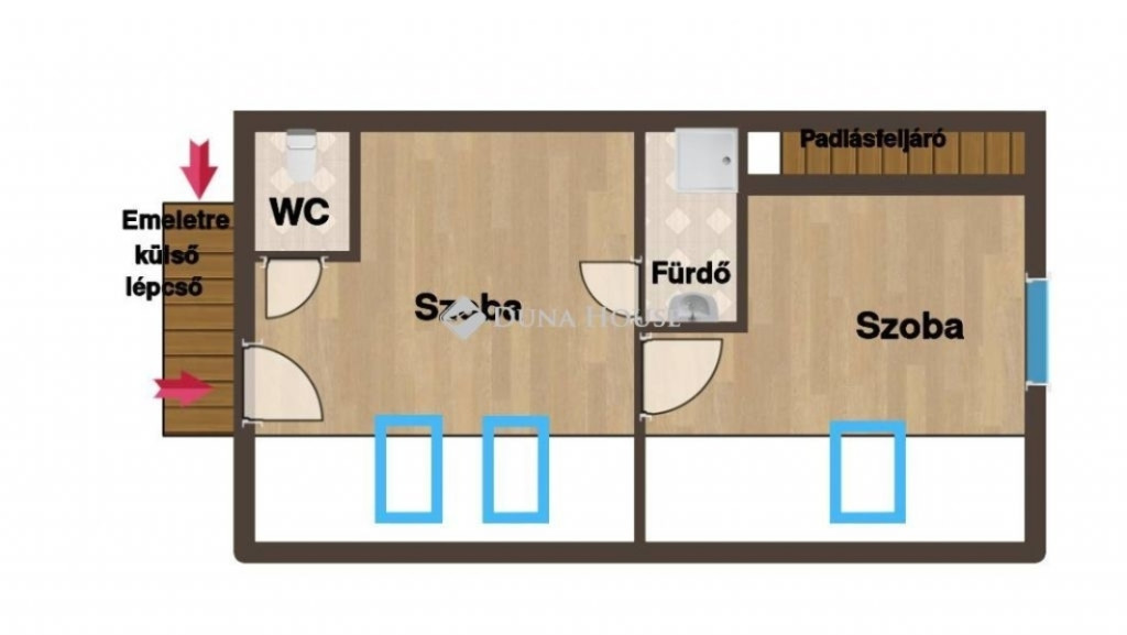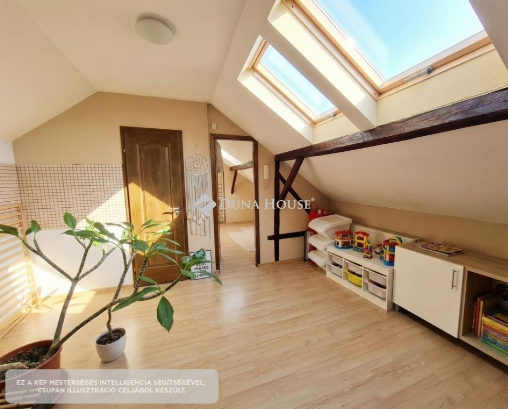 valamint egy külső lépcsőn megközelíthető, tetőtéri, önálló lakás (kb. 32 m²) található.