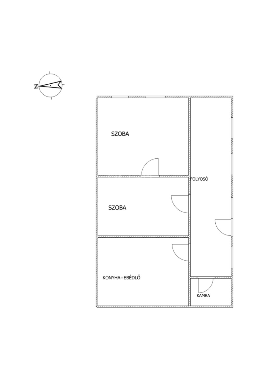 A 73m2-es ingatlanban: két szoba, konyha+ebédlő, kamra, folyosó.