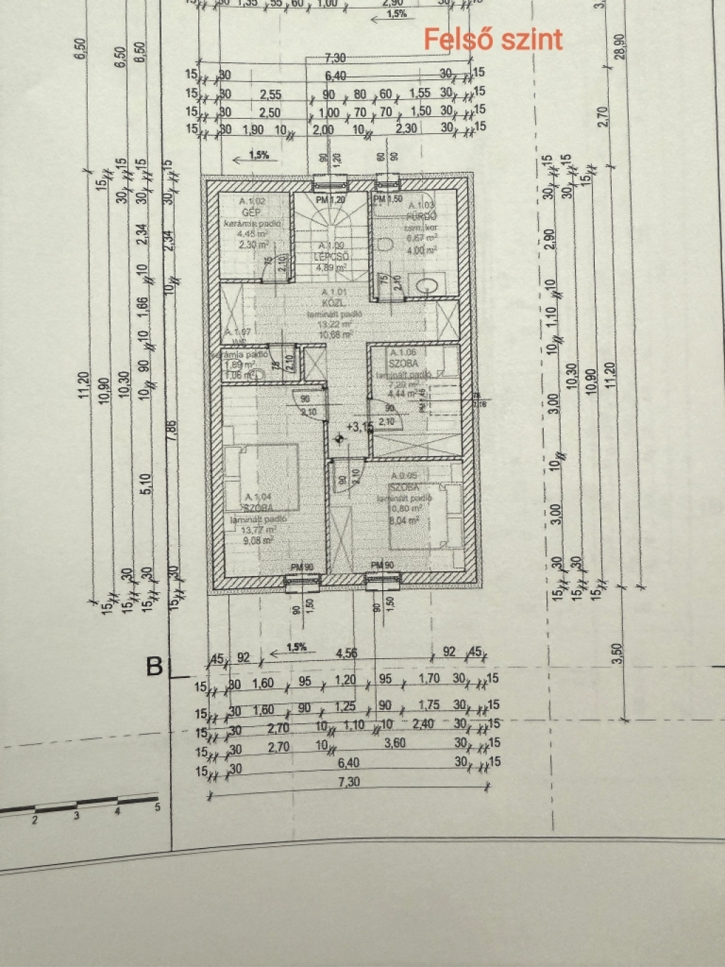 lépcsőház, közlekedő, gépészeti helyiség, kádas fürdőszoba, 3 hálószoba, wc.