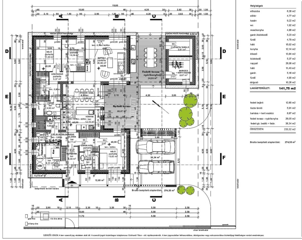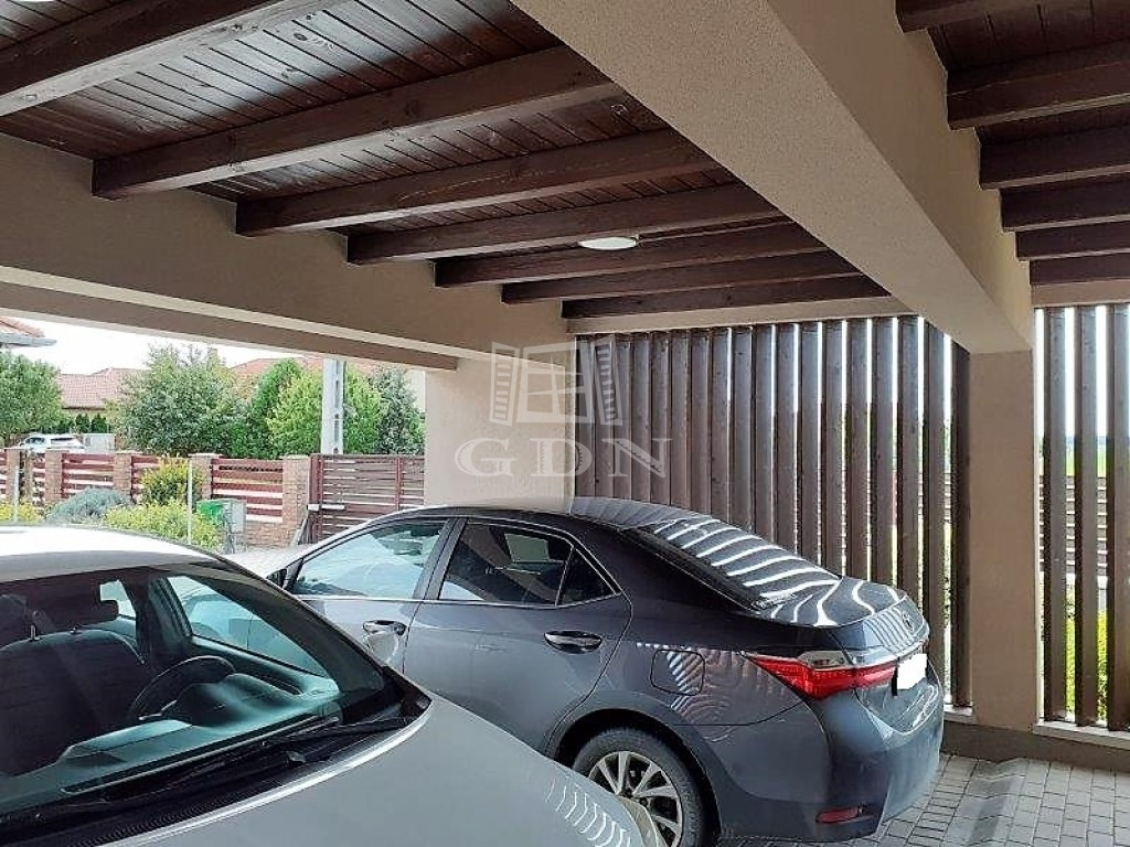 A két autó parkolására alkalmas fedett 38 nm-es gépkocsibeálló, egy egységet képez a házzal.