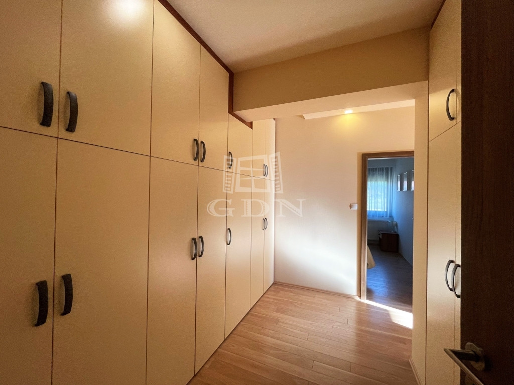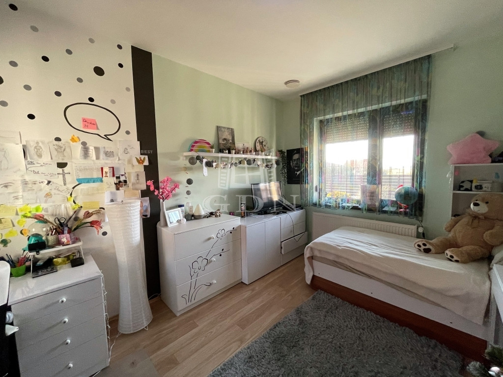A kertben található még egy 20nm-es kis ház (2cm-es szigeteléssel) járó lapozva a kerti eszközök tárolására illetve műhely lehetőséggel. Továbbá egy hintaágy+gyerek hinta illetve egy fedett, körbe zárt 10nm-es fatározó. A kert minden pontján biztosított az áramelérés, 5 helyen van vízcsap (ebből 2 DRV). A füves rész kivételével mindenhova került geotextília. Kb 100m2 a térkövezett felület ami az aszfaltútig kiér mind két kapunál.