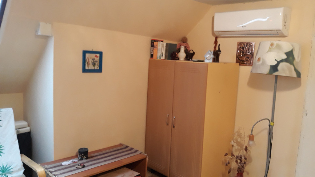 A közlekedőből csiga lépcső vezet a felső szintre, ahol tágas előtér, két félszoba, zuhanyzós fürdőszoba található.