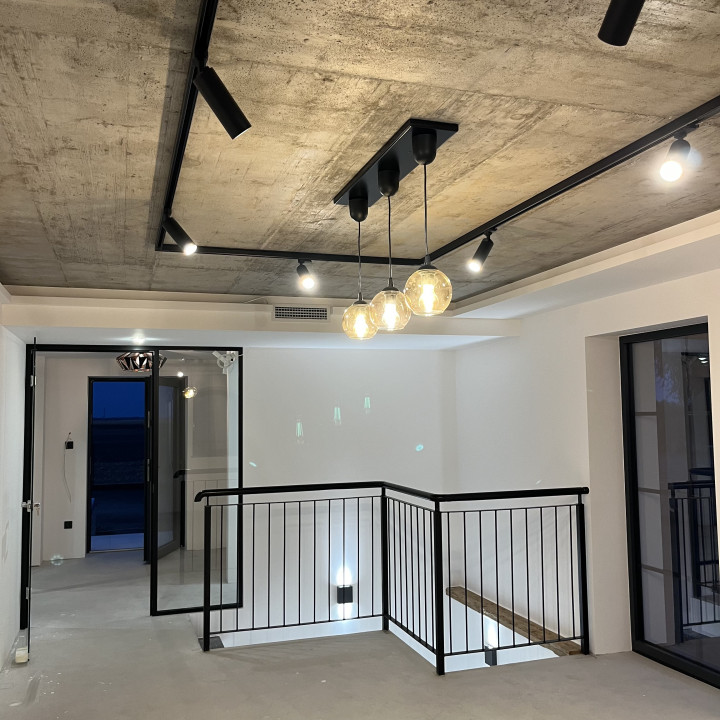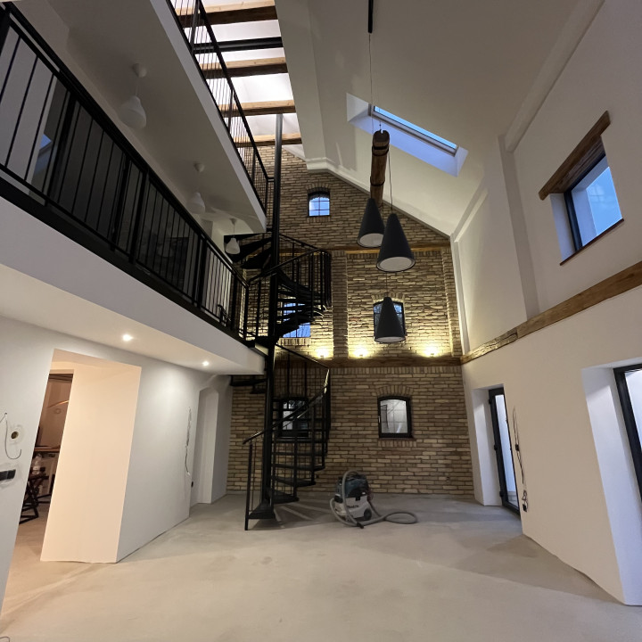 A ház központi eleme a galériás, monumentális nappali, ahol a 9,7 méteres belmagasság, a látszó téglafalak, valamint az eredeti fa gerendák különleges hangulatot teremtenek.