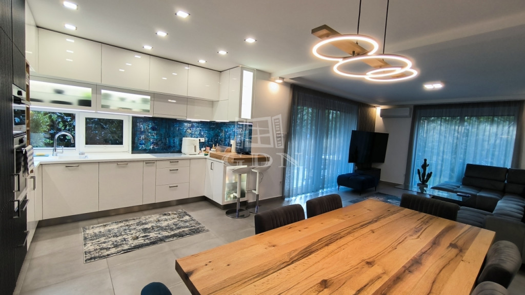 A földszinten az amerikai konyhás nappali mellett van még egy háló és egy fürdőszoba is, a lépcső alatt kis tároló. A nappaliból kilépve érünk a 34 négyzetméteres teraszra, az intimitást biztosító, karbantartott kertbe. Az emeleten 3 háló ( 2 teraszos), egy fürdő és a szauna helység található zuhanyzóval.