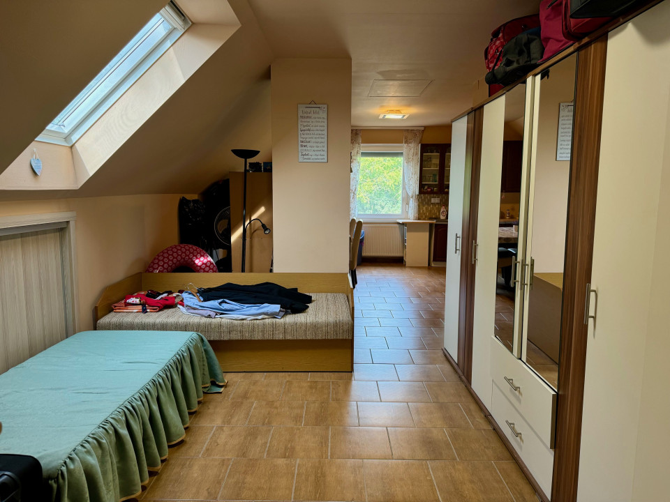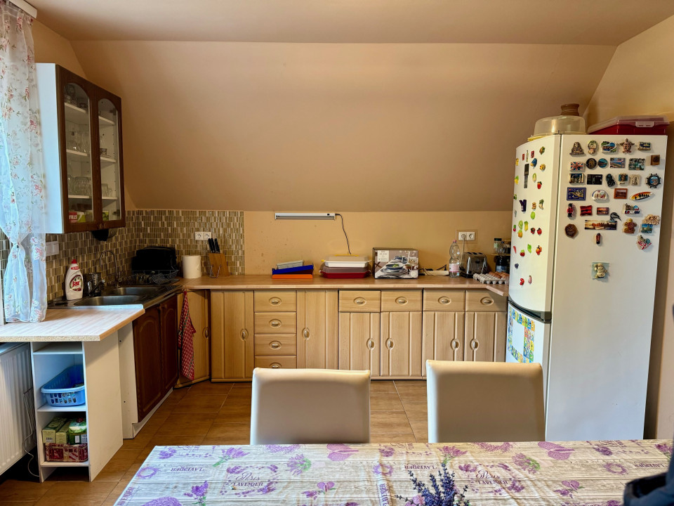 Emelet: nappali–konyha–étkező egy légtérben, 1 hálószoba, fürdőszoba WC-vel és bidével.