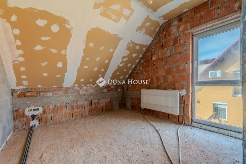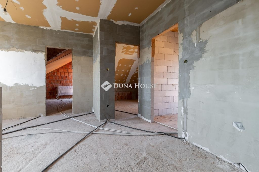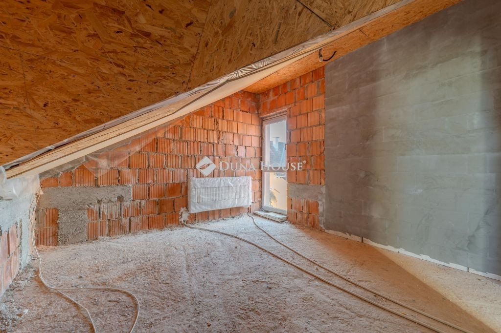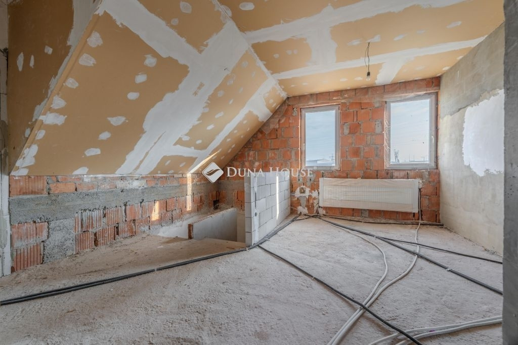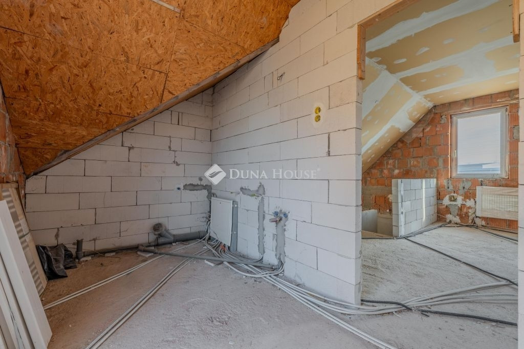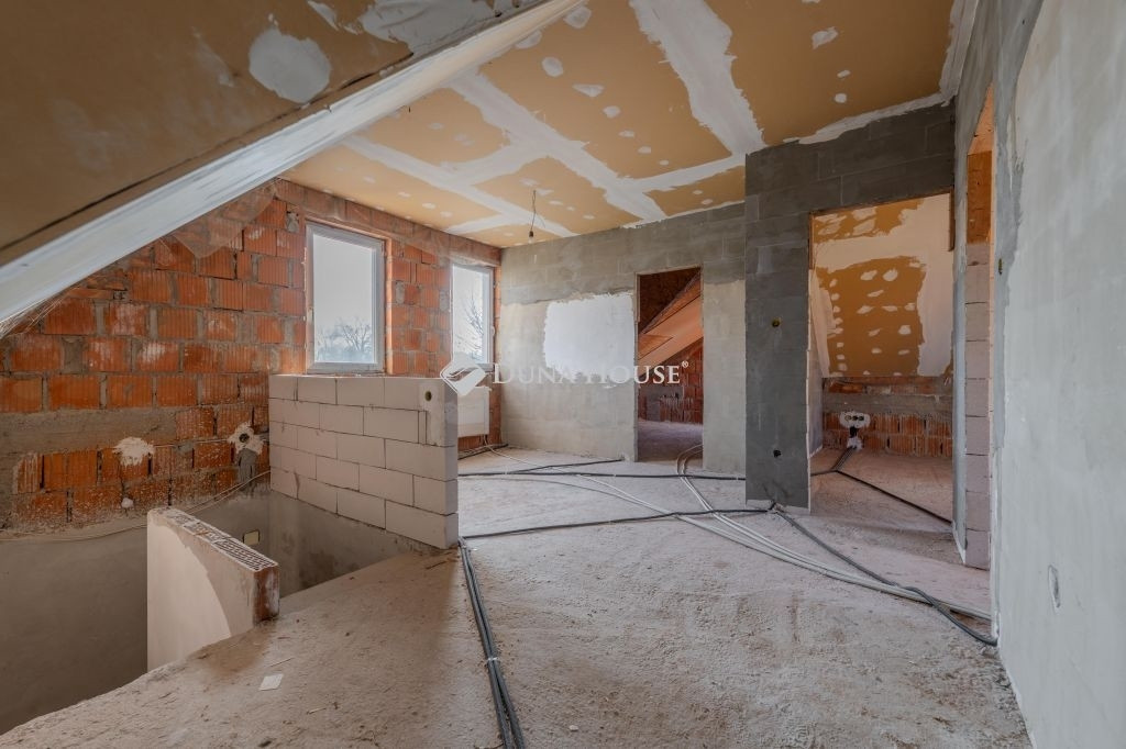 Az alsó szint 85 m2: tágas amerikai konyhás nappali+étkezőből , két szobából,egy fürdőszobából áll. A nappaliból közvetlen kijárat van a 15 m2-es fedett teraszra, valamint a kertbe. A földszinti tér központi eleme a majd 5,2 méter hosszú konyhapult. Az emeleti szint szerkezetkész állapotban van. A fenti 60 m2-es térben három szoba,és egy fürdőszoba alakítható ki.