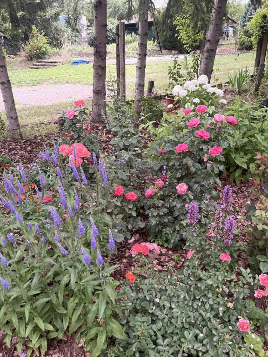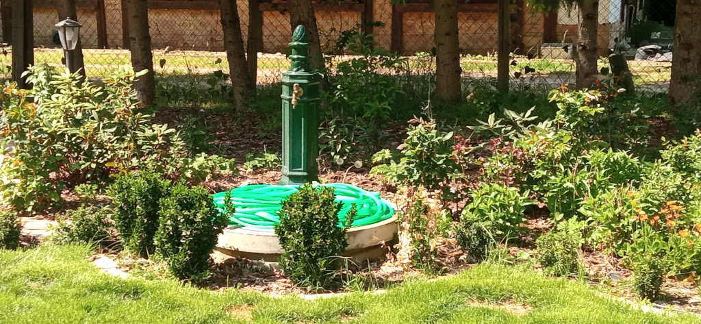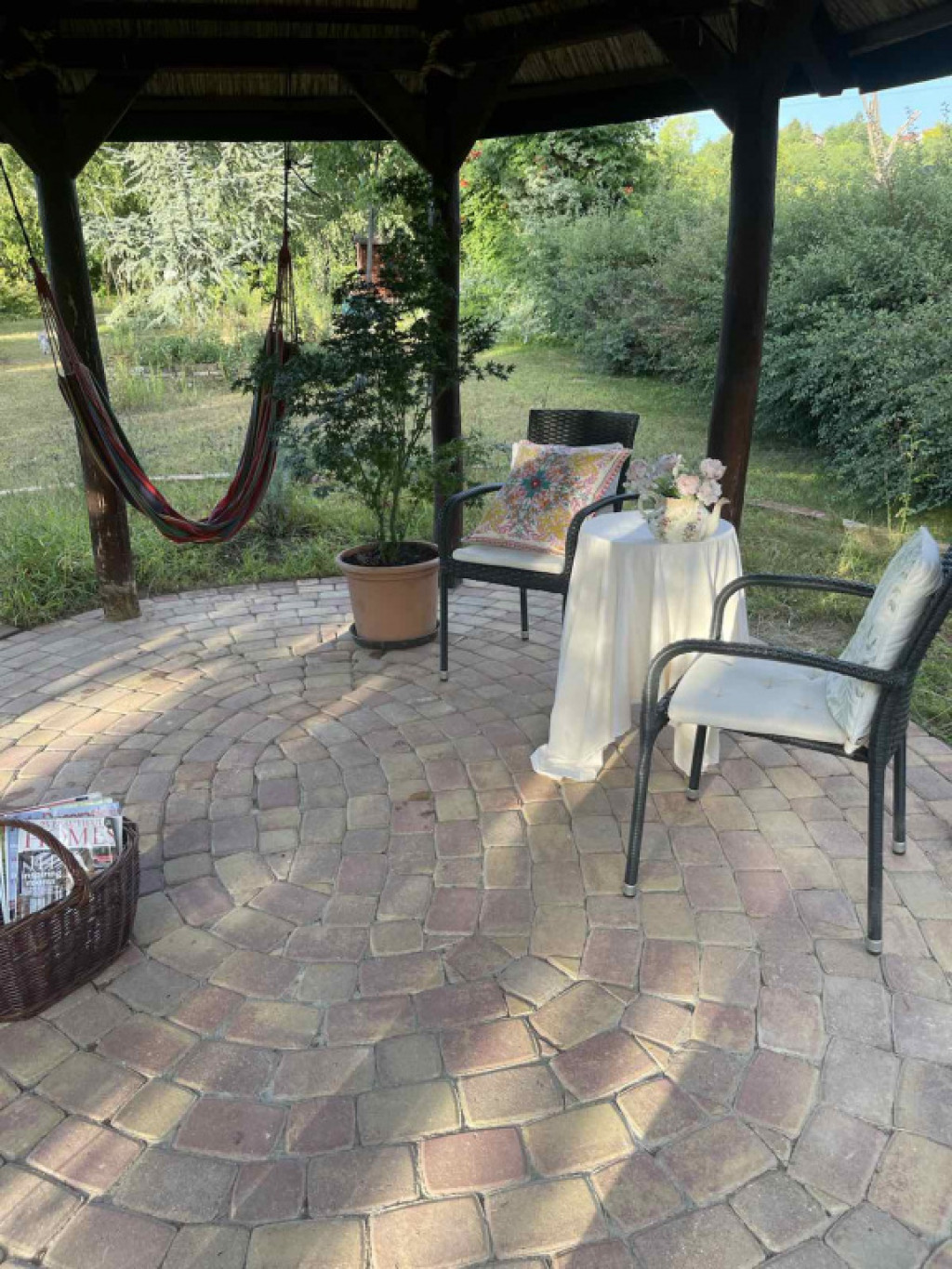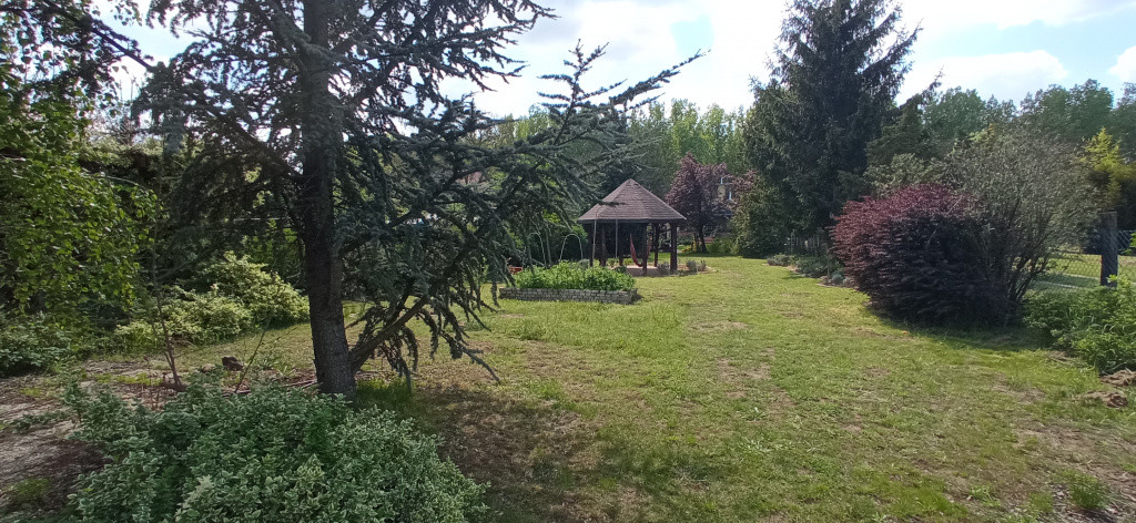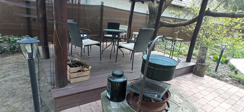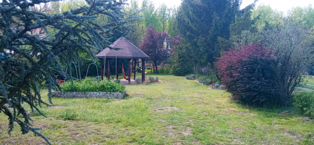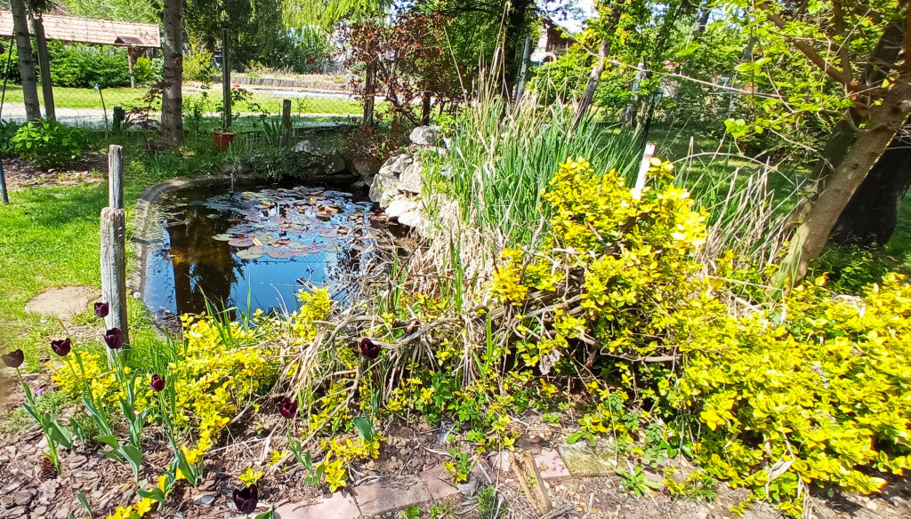 A télikertből egyenesen a mediterrán jellegű csodaszép kertet látjuk. Megnyugtató hangulatát kihasználhatjuk étkezőnek, vendégfogadásra, pihenésnek. Egy hűtő-fűtő légkondicionáló gondoskodik róla, hogy egész évben kihasználható legyen ez a helyiség. A télikertből ajtó nyílik az igényesen megtervezett kertbe. A különleges rózsák, levendulák, örökzöld dísznövények között kacskaringós út vezet el a kerti tóhoz, majd továbbhaladva két szaletli is található. A sütögető mellettiinek új az alapja és a burkolata is. A házhoz közelebbiinek épített kerti főző-sütögető kapott helyet. Itt főzhetünk a nyári melegben. A kert legvégében nyárfaliget kapott helyet. A locsoláshoz fúrt kút biztosítja a vizet.