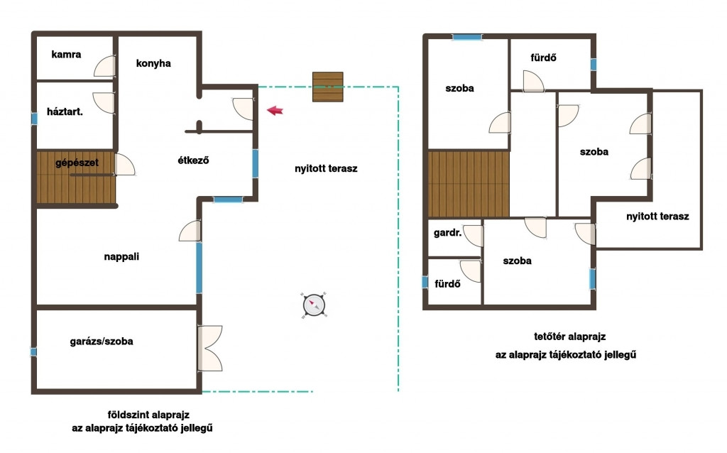 Földszinten kialakításra került: előtér, tágas nappali konyhával és étkezővel, közvetlen teraszkapcsolattal, kamra, közlekedő, garázs, gardrób, kádas-zuhanyzós fürdőszoba, valamint háztartási helyiség.