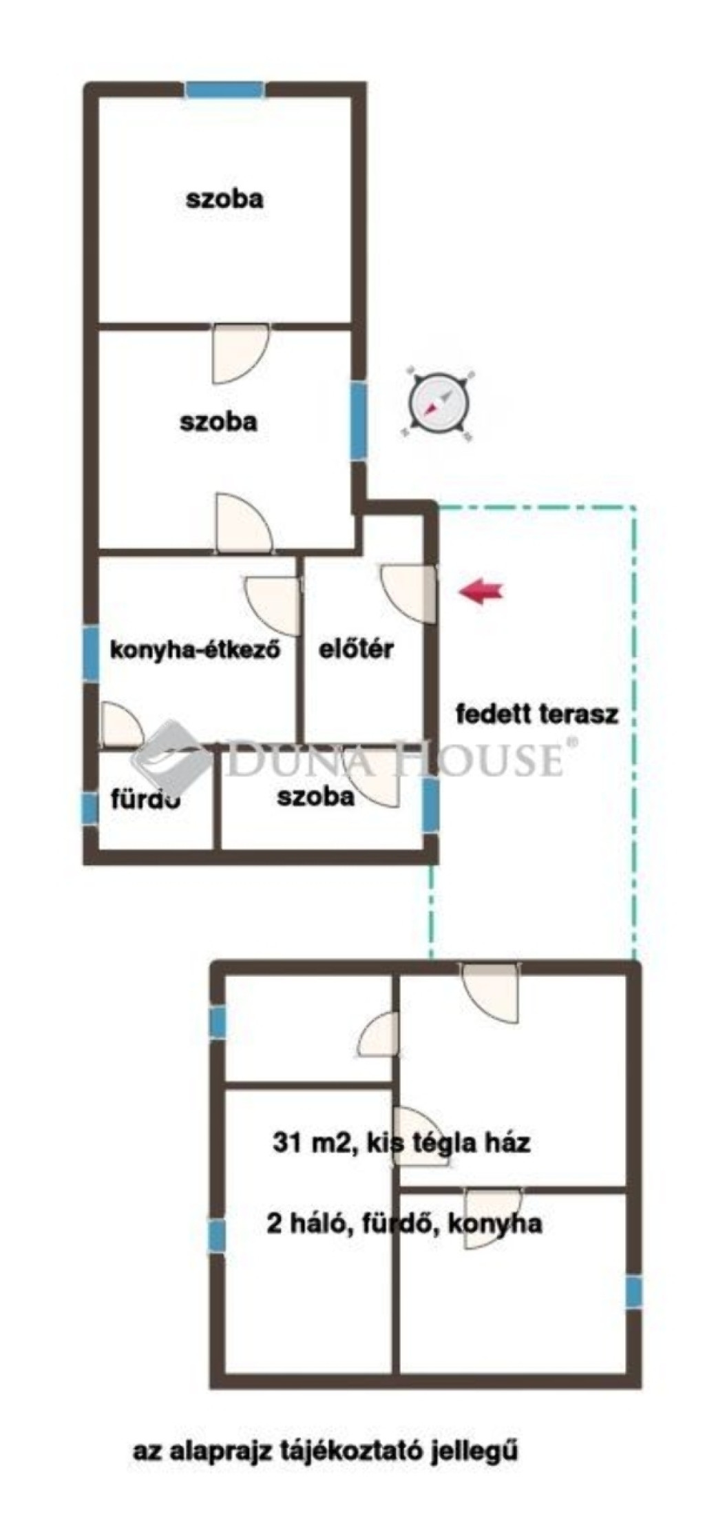 Az 1057 m2-es füvesített telken található egy 1988-ban, téglából épített, 2 szobás ház, valamint egy lakható melléképület, melyek az utóbbi 3 évben nyerték el jelenlegi formájukat: helyet kapott itt egy előtér, konyha-étkező, nappali, szoba és egy félszoba. Mindezeket egy 20 m2-es fedett teraszról tudjuk megközelíteni. A felújítás során új nyílászárók kerültek beépítésre, a szobák laminált padló burkolatot kaptak, újra rakták a cserépkályhát, amely teljesen üzemképes és jól működik. A fűtés egyébként megoldható a konvektorokon keresztül is, de a jelenlegi tulajdonos a klímát használja, melyből kettőt is felszereltek.