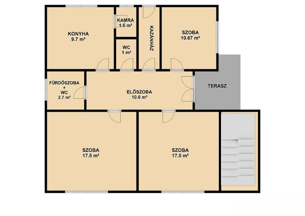 Emelet: 2 szoba, nappali, étkezős konyha, kádas fürdőszoba, mellékhelyiség.