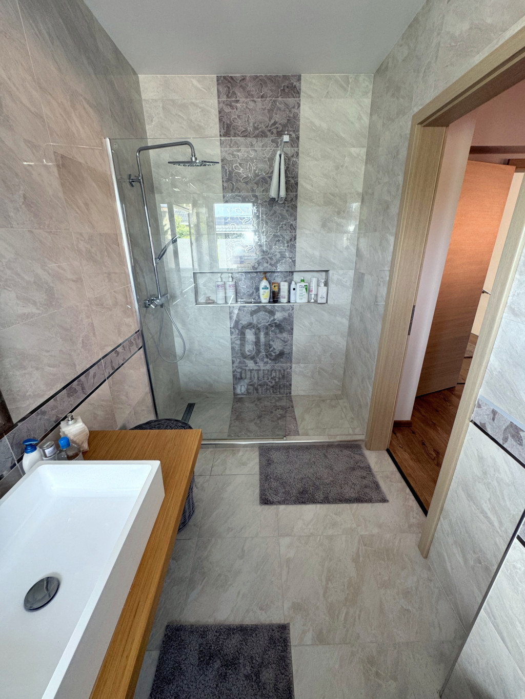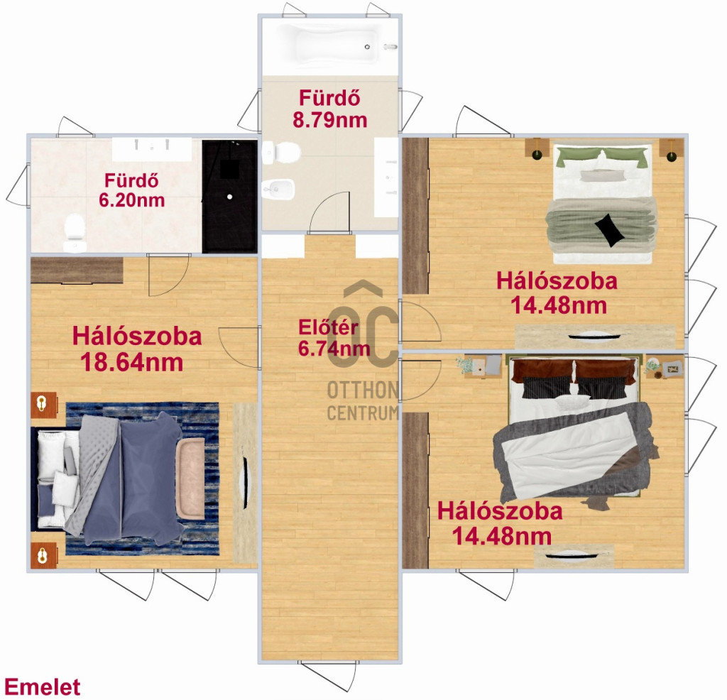 + A felső szinten három külön nyíló szoba erkély kapcsolattal, valamint két fürdőszoba található, egyikük közvetlenül az egyik hálószobából nyílik, így teljesen privát.