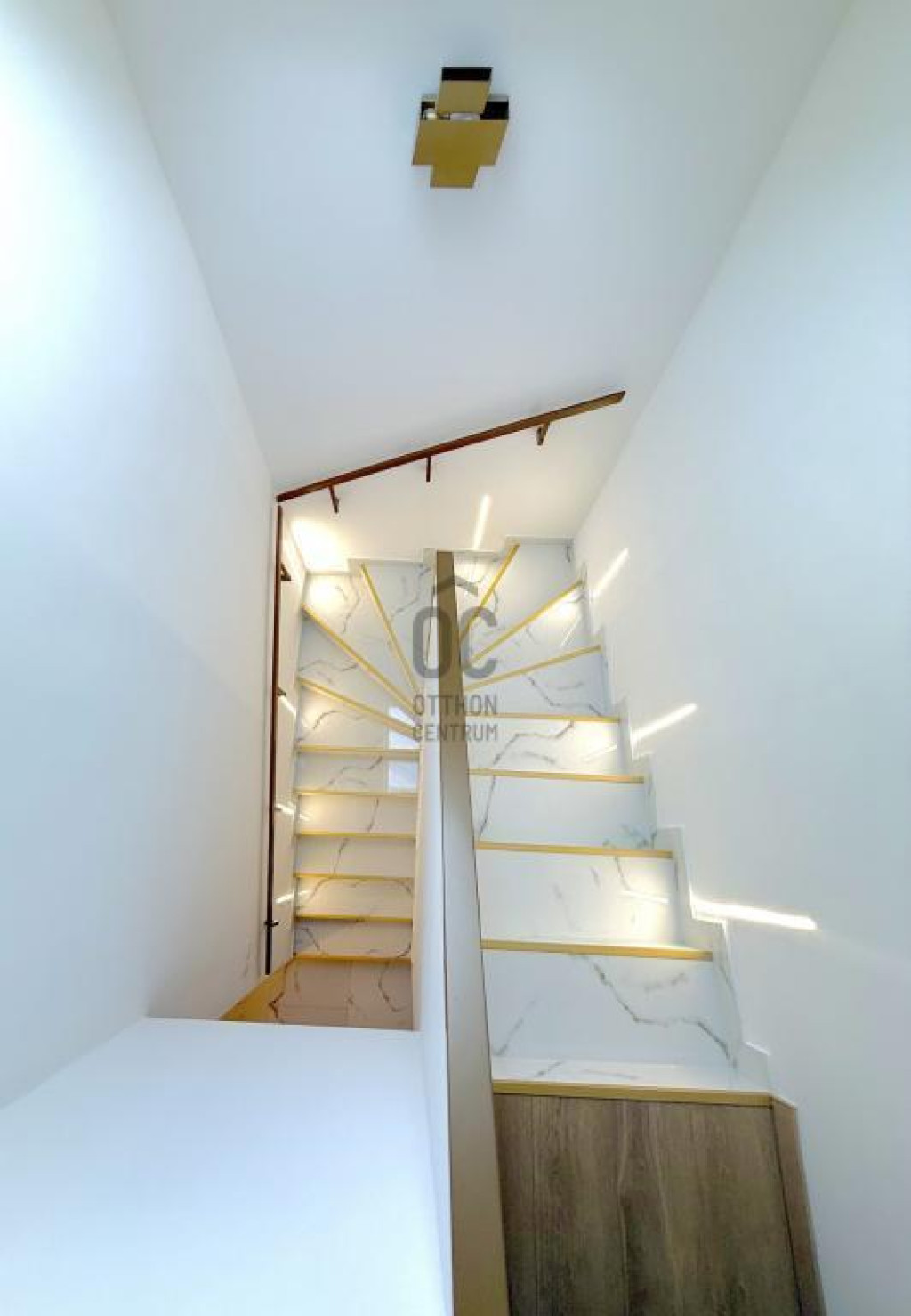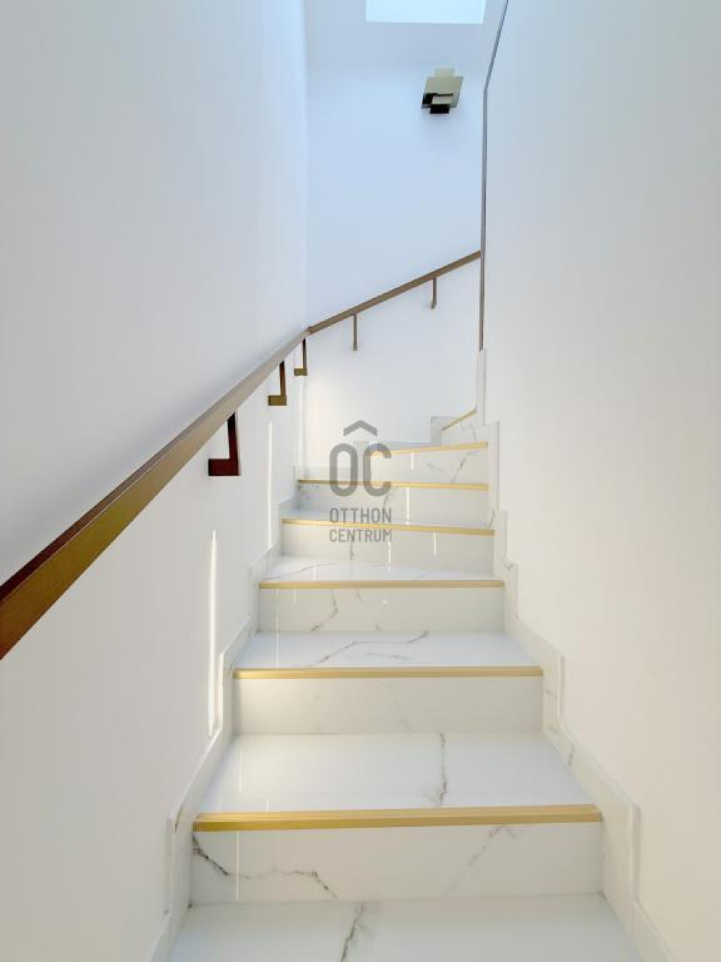 Belső kialakítás: Egyedi gipszbeton lépcső (50 év garanciával), új beltéri ajtók , rejtett világítás és spotvilágítás a földszinten.