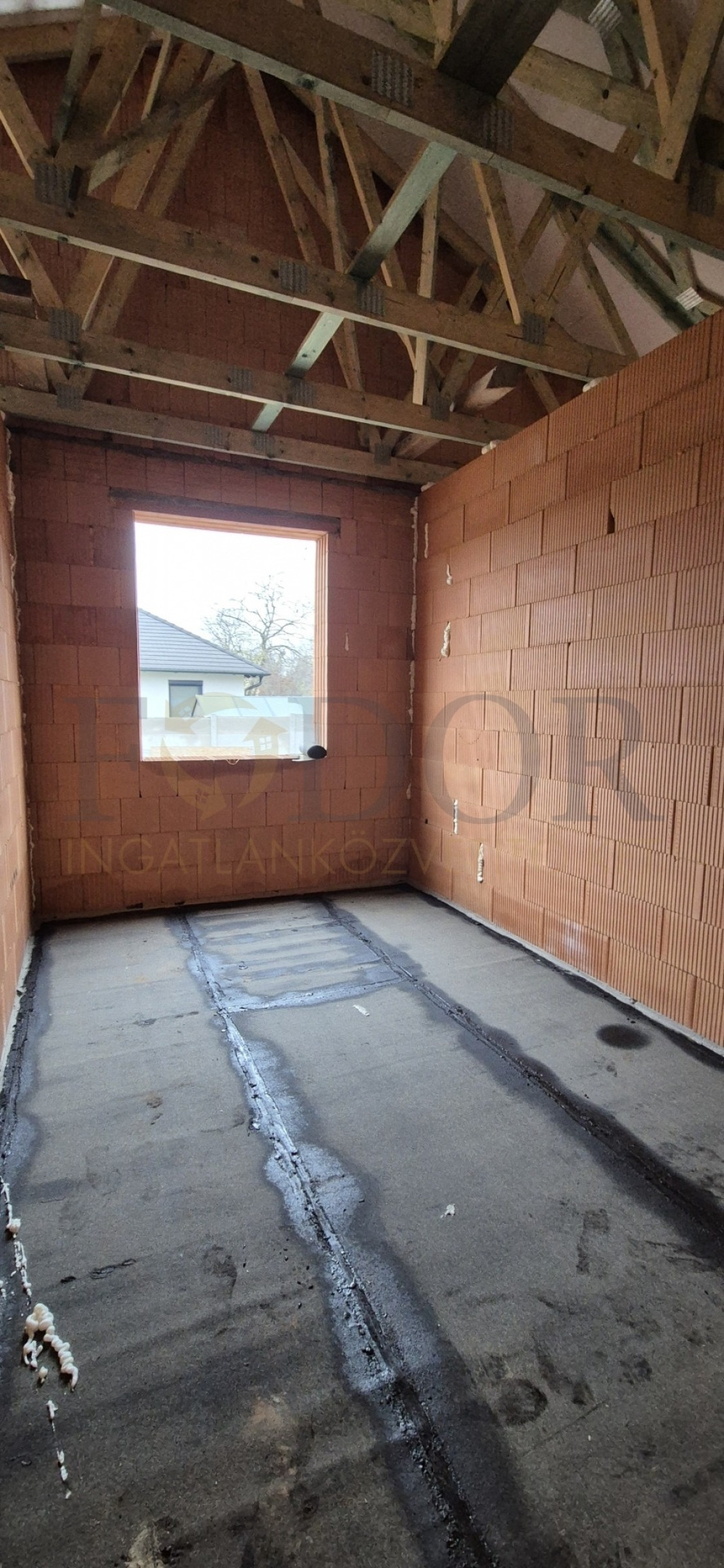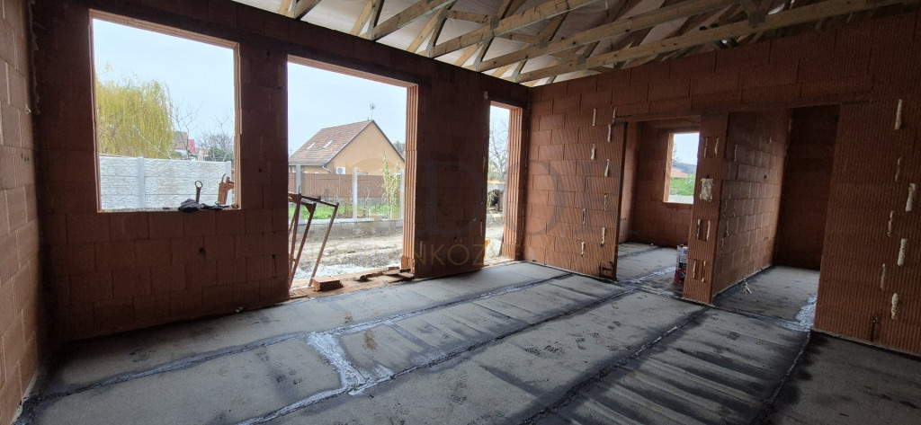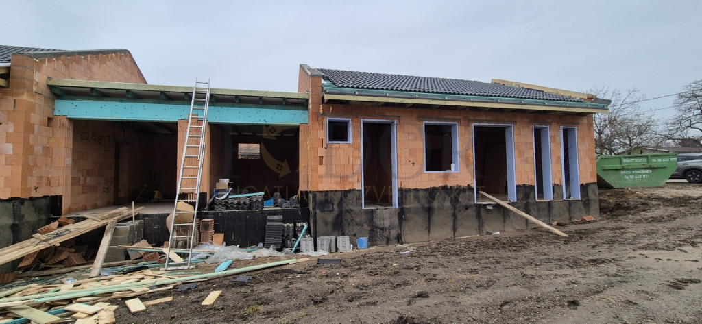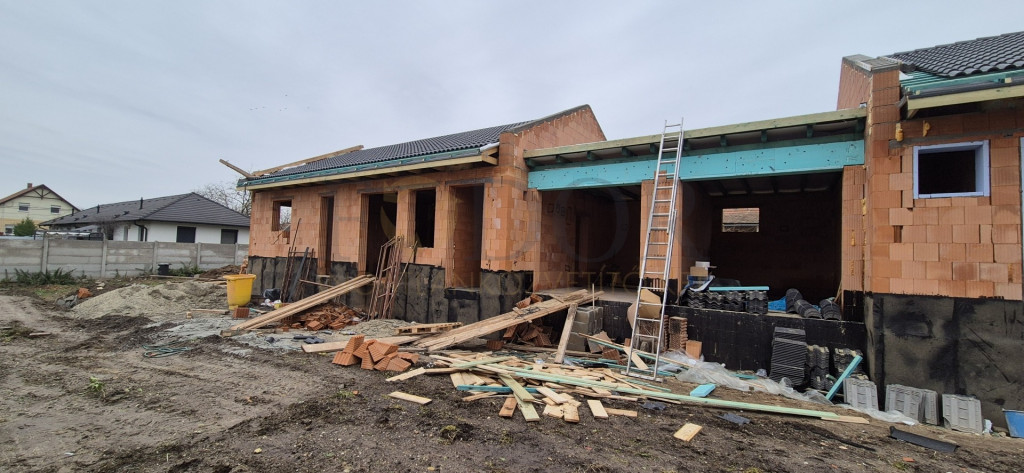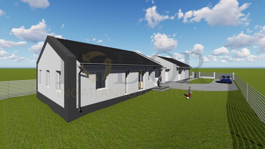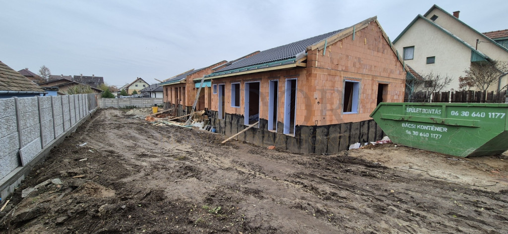 Az első, utcafronti ingatlan 104,9 millió forintos áron elérhető. A nettó lakótér 79,51 négyzetméter, amelyhez egy 17,67 négyzetméteres garázs, valamint egy 4,8 négyzetméteres terasz kapcsolódik. A 278 négyzetméteres telken épült házban két hálószoba és egy világos, tágas nappali található, a fürdőszoba és a WC külön helyiségben kapott helyet. A modern, energiatakarékos hőszivattyús fűtés padlófűtéssel kombinálva biztosítja az otthon melegét. A tetőtér nem beépíthető, így a földszintes kialakítás egyszerű, akadálymentes életteret kínál. A riasztórendszer kiépítéséhez minden előkészület megtörtént, a parkolás pedig az utcán ingyenesen megoldható.