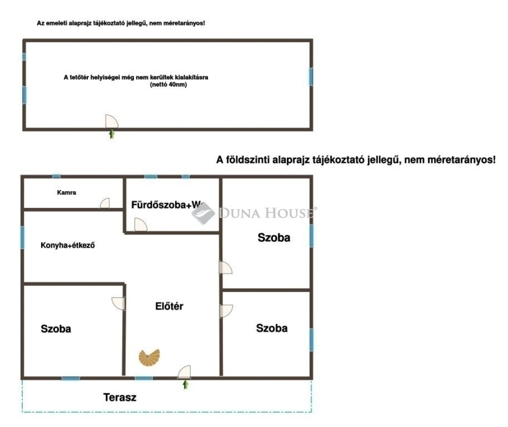 Az emelet (40nm) jelenleg beépítésre van előkészítve, tehát itt a fantázia szabadjára engedhető. További 3 szoba és fürdőszoba kialakítható.