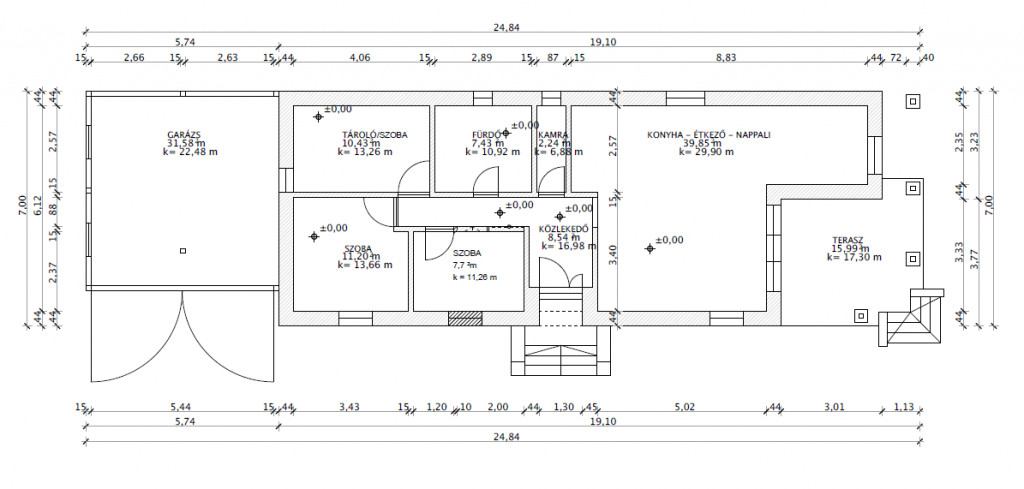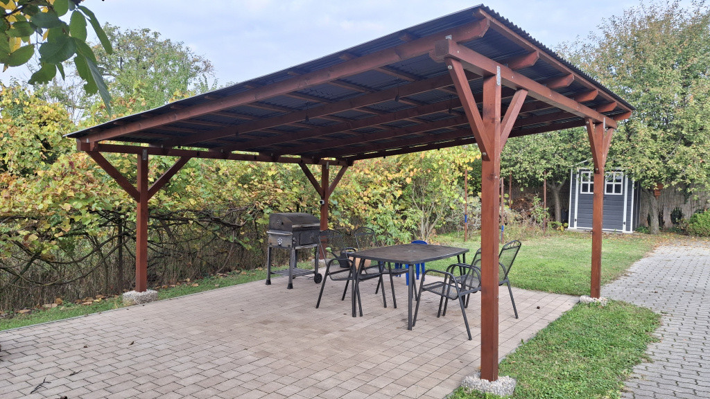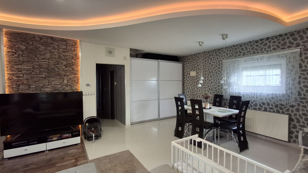 hangulatos, 40 m2 amerikai konyhás nappali, 3 szoba ,előszoba, háztartási helyiség, fürdőszoba, 16 m2 fedett terasz, 32 m2 két autó beállására alkalmas garázs.