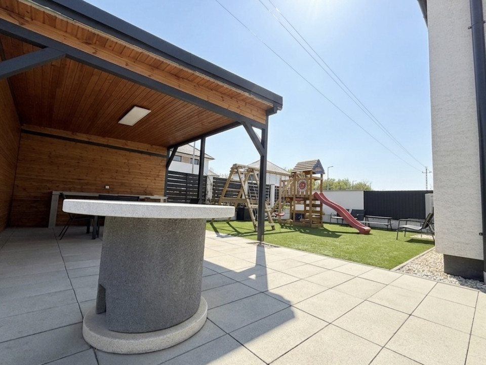 • Extrák a kertben: Saját, szeparált kert 20 m2-es szigetelt, világítással ellátott kerti pavilonnal (szaletli) – tökéletes jakuzzinak vagy sütögetéshez!