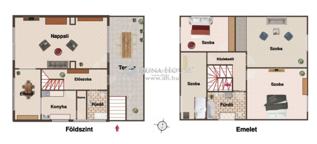 Földszint: nappali, étkező, konyha, kamra, fürdőszoba WC-vel, előszoba lépcsőfeljáróval