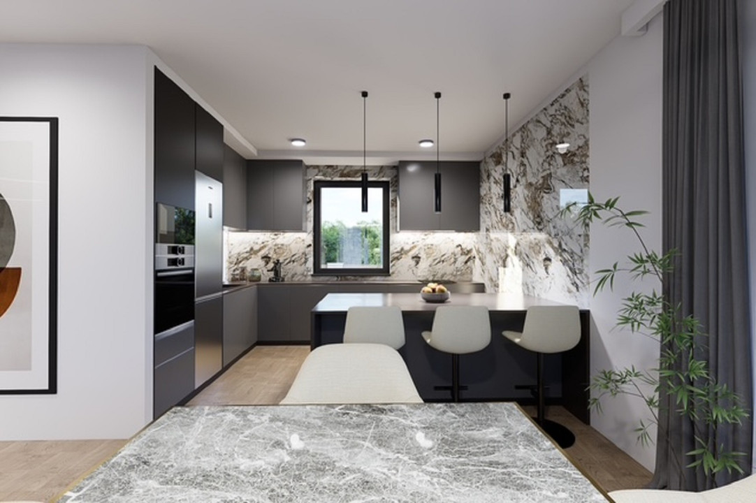 -A konyhában antarcit konyha bútor beépített gépekkel: villany főzőlap, mikro, villanysütő, elszívó, mosogatógép.