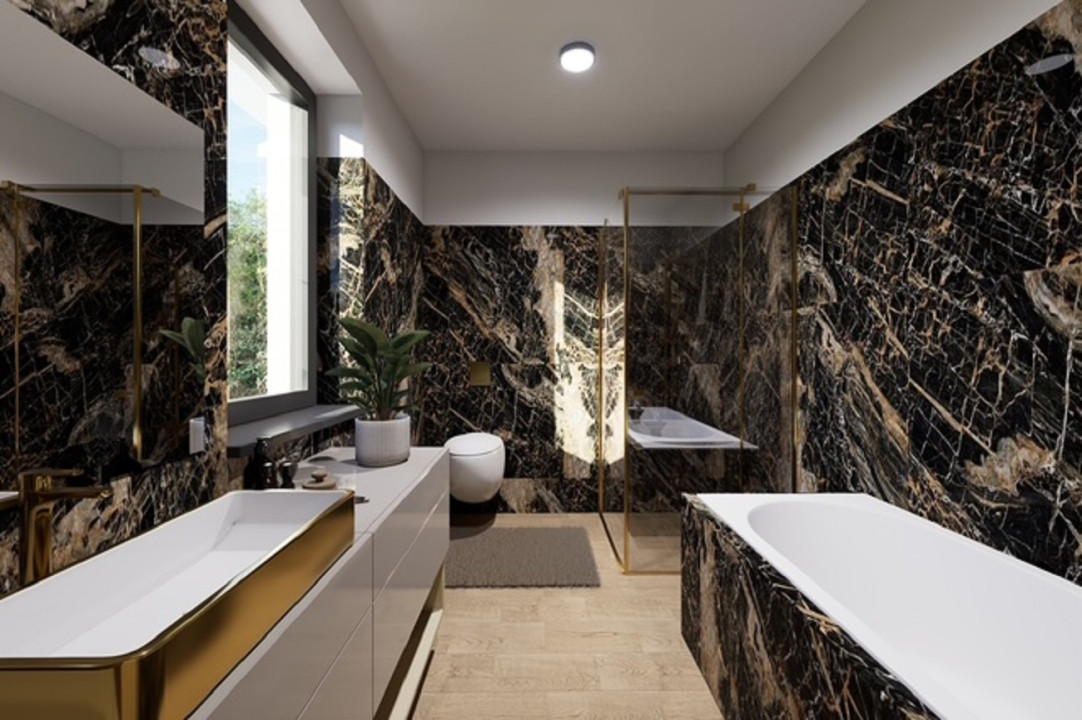 - A nagyobb fürdőszobában fekete, szabadon álló Wellis Fürdőkád, szálcsiszolt aranykeretű LED tükör,