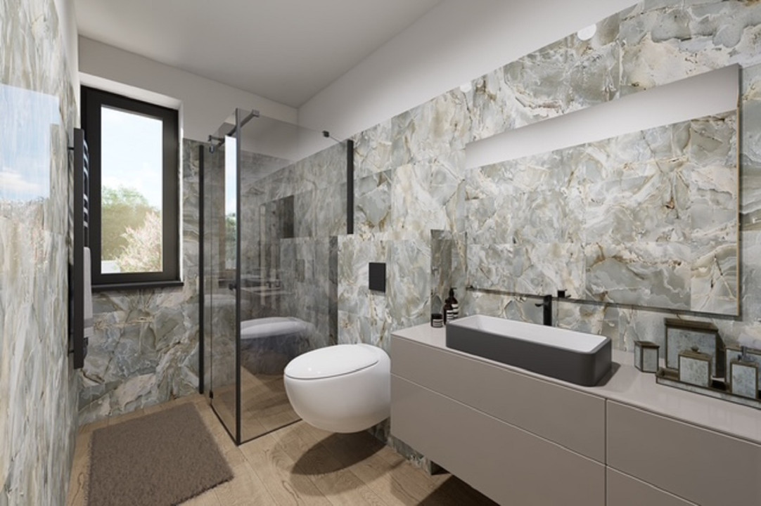 -Dupla fürdőszoba, melyek közül az egyik káddal, zuhanyzóval wc-vel, a másik zuhanyzóval kerül kialakításra. A további praktikumot a bejárat melletti különálló wc biztosítja.