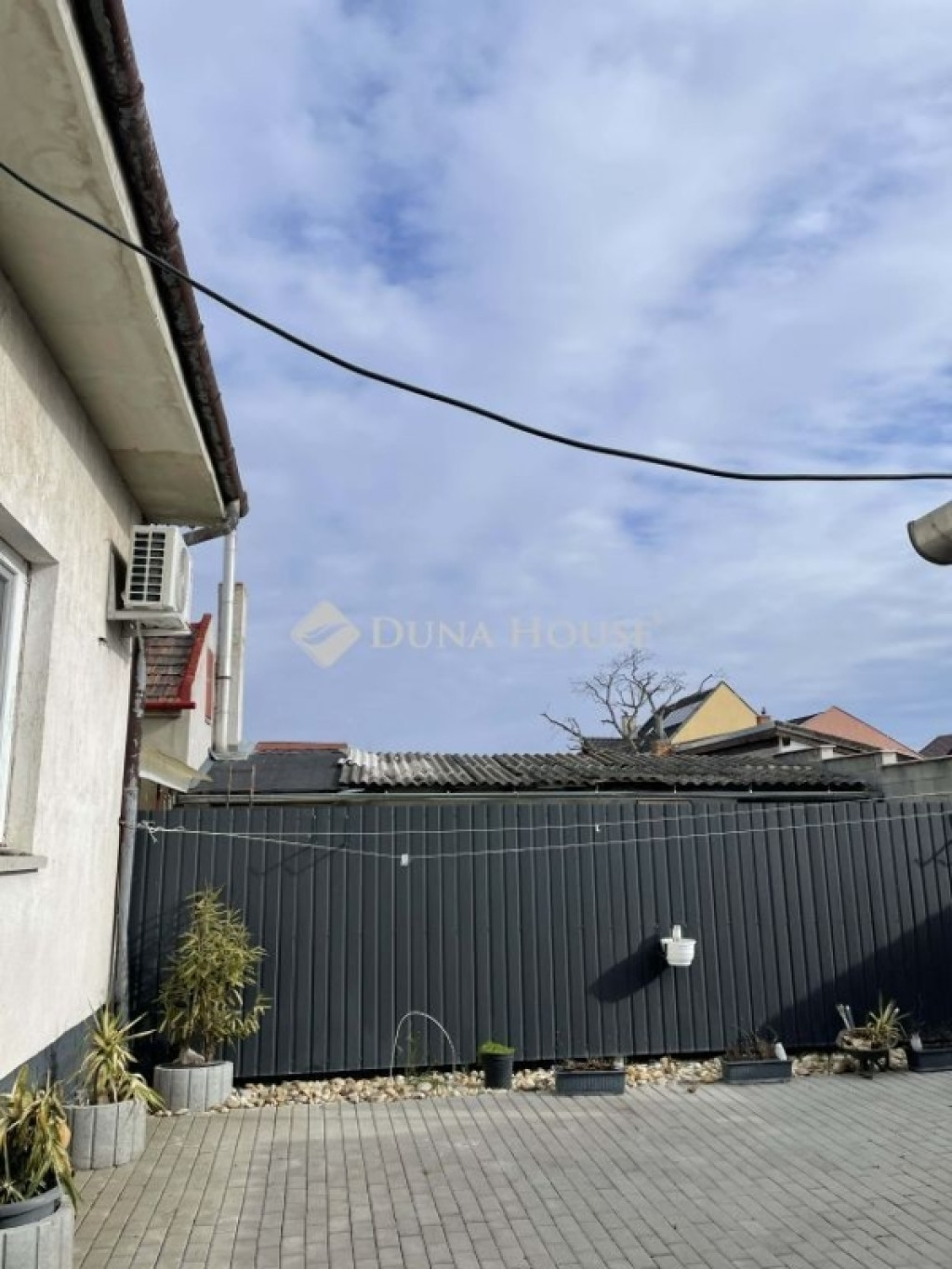 Az ingatlan egy 195 m²-es, teljesen térkövezett telken helyezkedik el, rendezett udvarral és praktikus kialakítással.