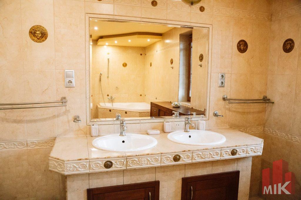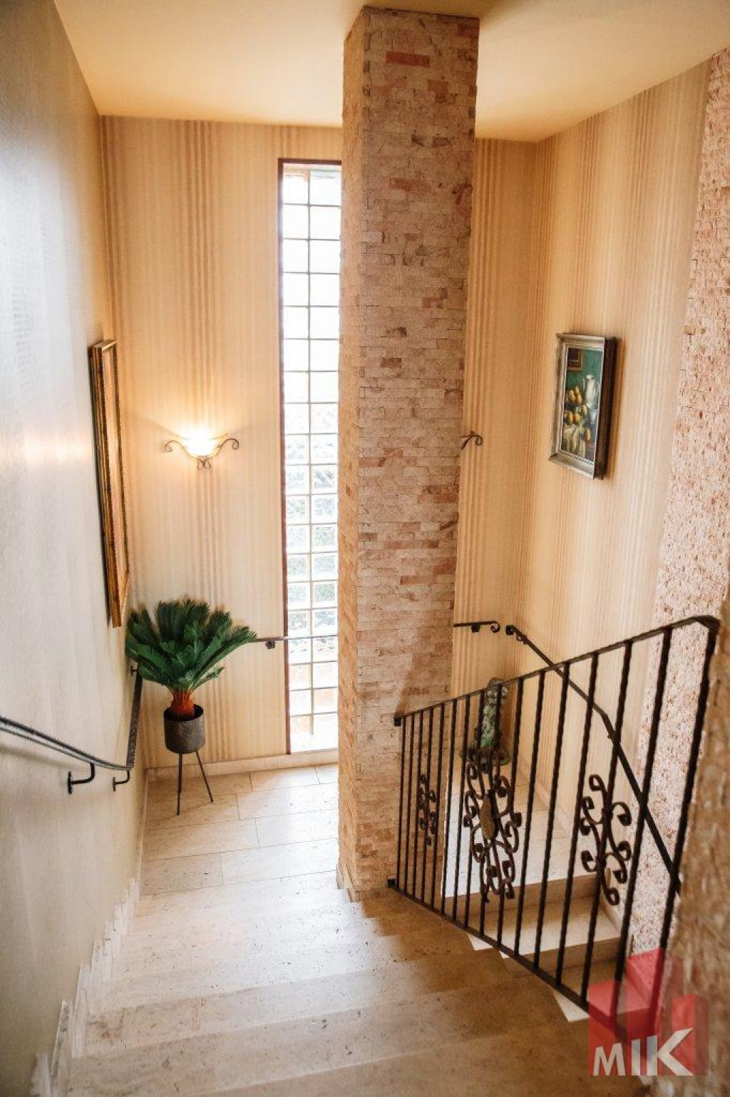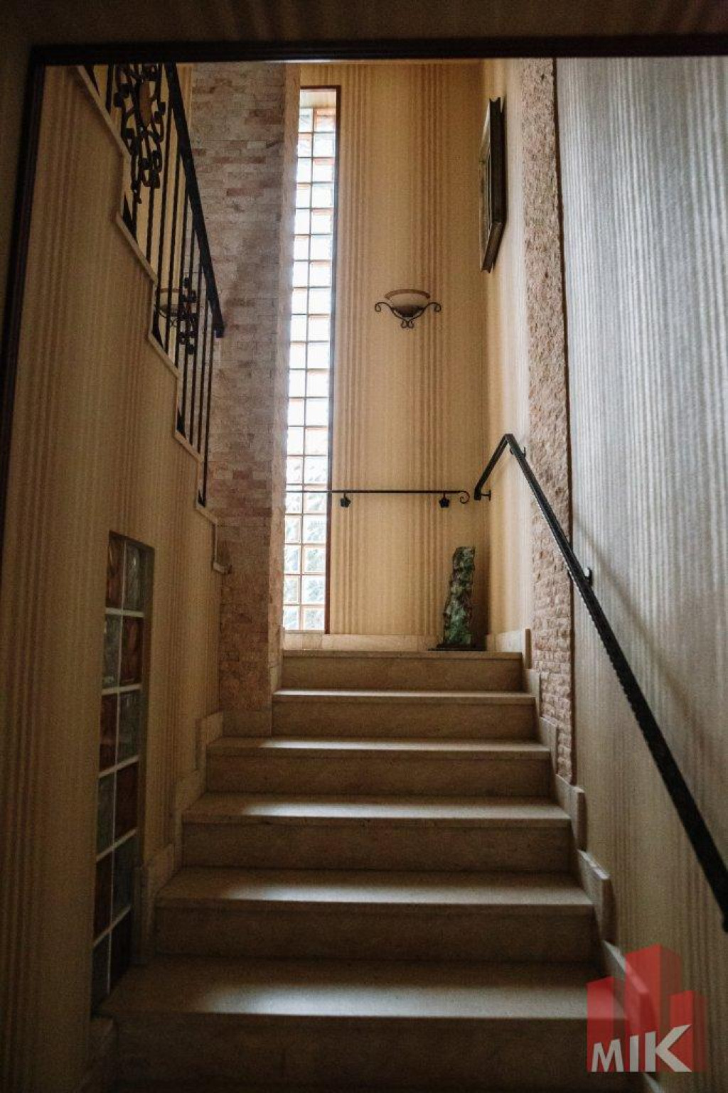 A főépület belső, kétszintes lakótere önállóan 330 m2. Az első szinten, egy légtérben található a nagy nappali és konyha az étkezővel, teraszkapcsolattal, valamint innen nyílik a dolgozószoba, szemben vele egy tágas fürdőszoba. Tovább lépve csekély szintkülönbséggel érhető el a wellness-részleg, ugyancsak teraszkapcsolattal.