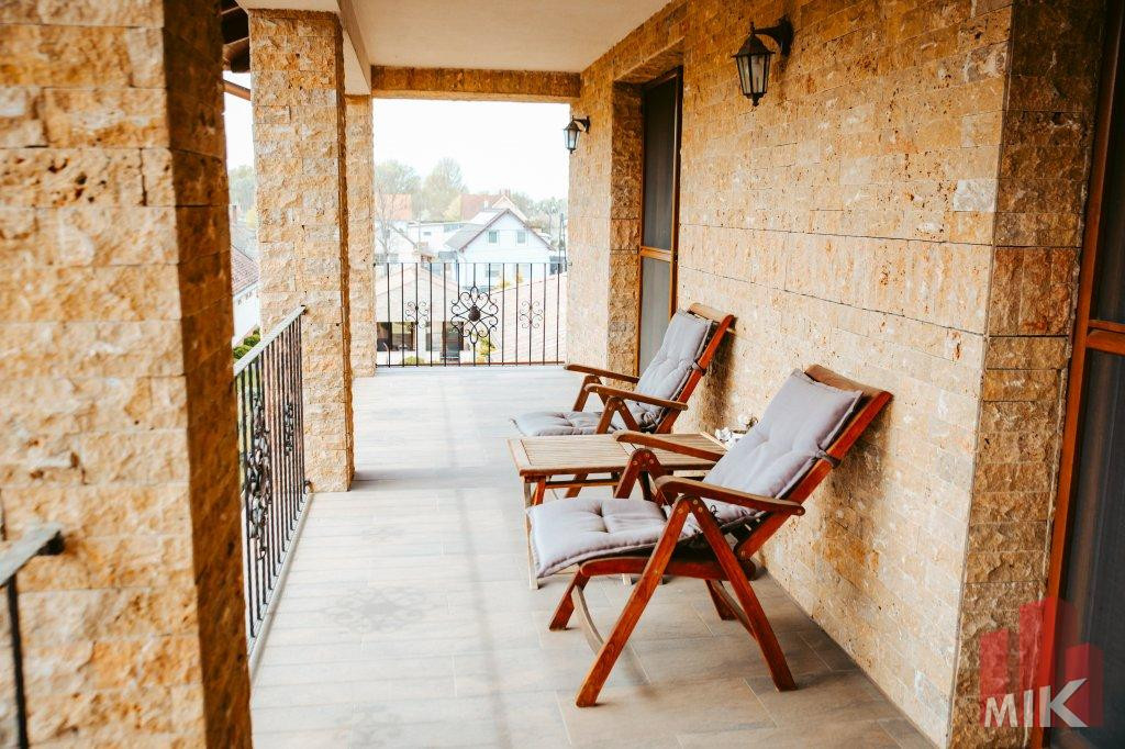 Az emeleten van három szoba, fürdőszoba, beépített szekrények. Minden szoba D-DK-i tájolású, és minden szobából kiléphetünk a 30 m2-es fedett erkélyre.