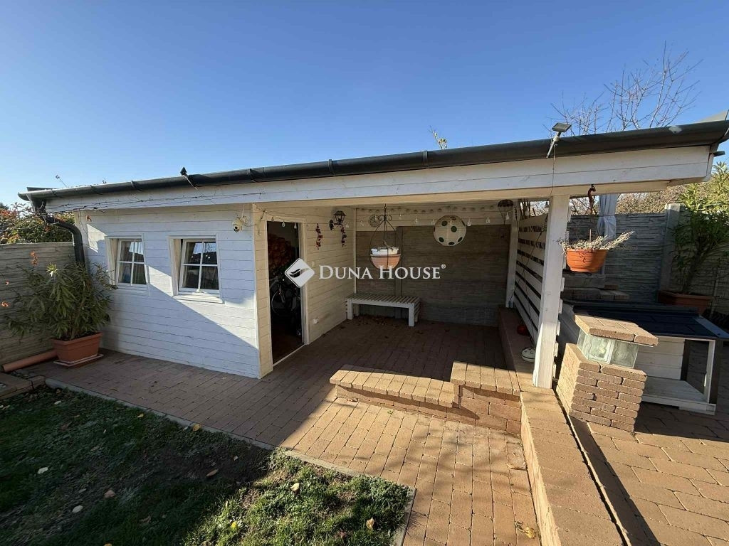 Egy hőszigetelt, fedett teraszos faház is helyet kapott, mellette füvesített udvar, kerti csap, és magaságyások teszik teljessé a komfortot.