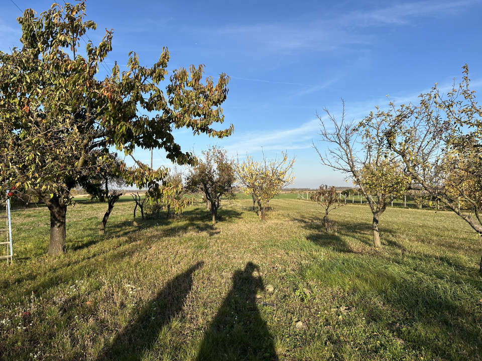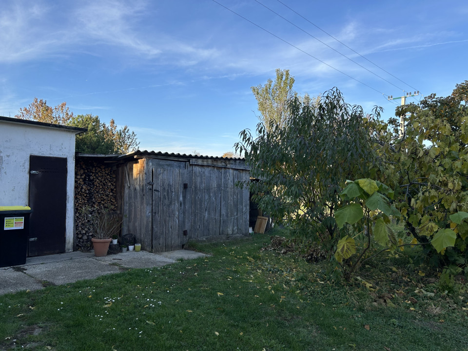 Az udvar rendezett, térkövezett, több gk.parkolására alkalmas. Kerítés az utcafronti szakaszon található. A kert gondozott, számos gyümölcsfával beültetett: füge, alma, szilva, barack, cseresznye, meggy, dió. További növények: szőlő, szeder, málna. A kerti szerszámok tárolására az udvaron található egy kb.: 3 nm alapterületű, panel elemekből épített, valamint egy kb.: 6 nm alapterületű, fából épített tároló. A helyi beépítésre vonatkozó szabály lehetővé teszi garázs, vagy további épület építését.