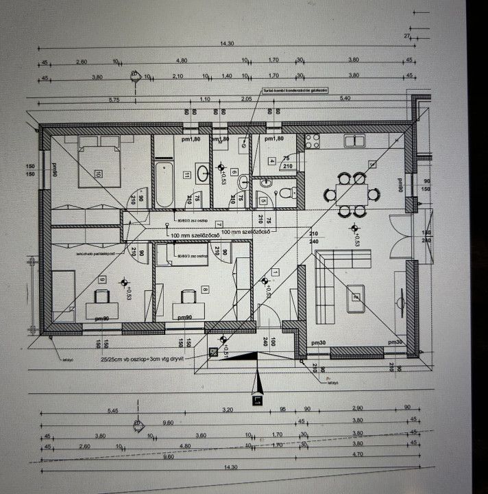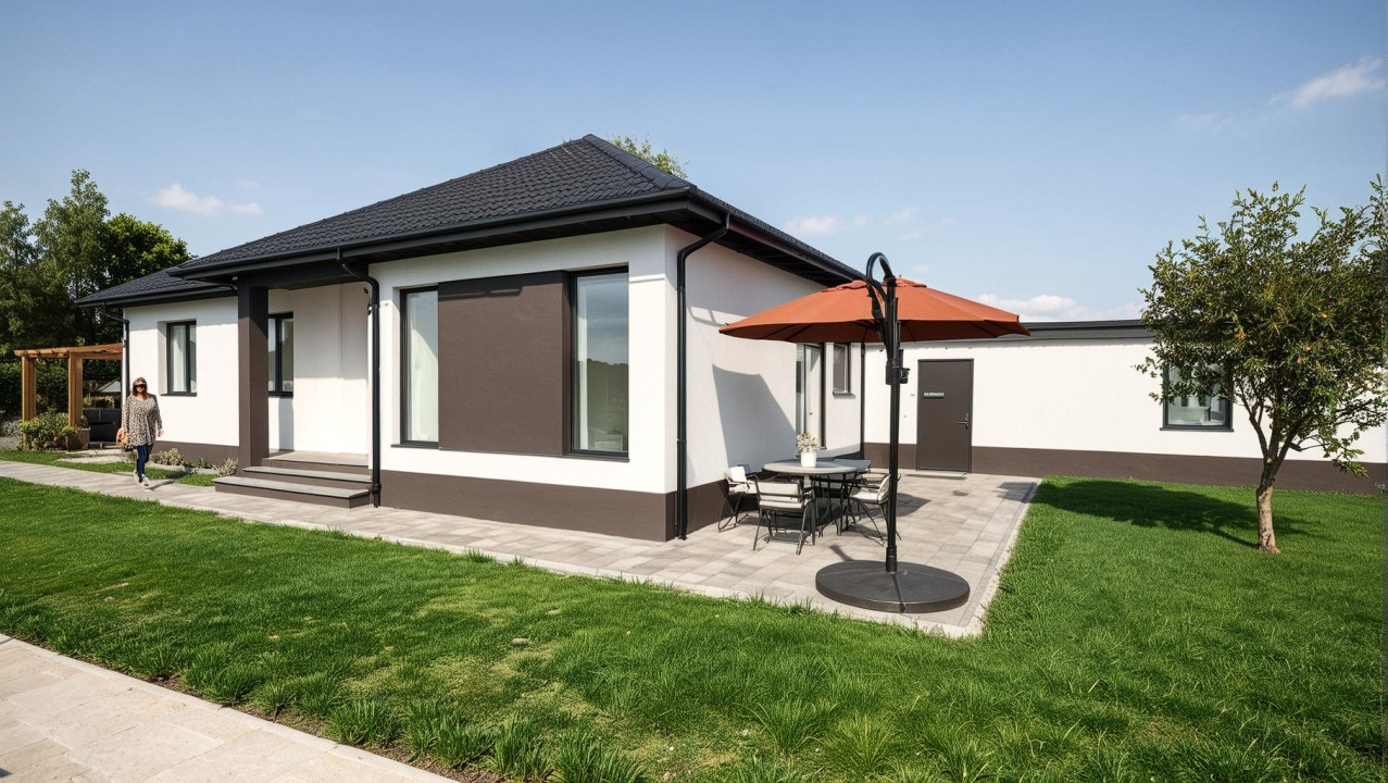 A belső terek elrendezése a következő: előszoba, közlekedő, nappali-konyha-étkező (közvetlen kert kapcsolattal), kamra, 3 külön nyíló szoba, fürdőszoba, háztartári helyiség, külön álló WC.